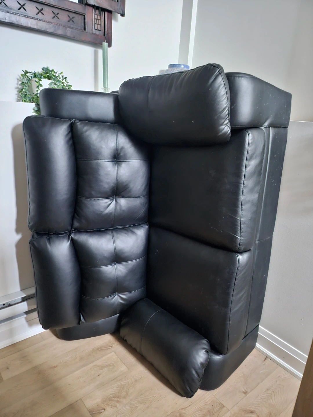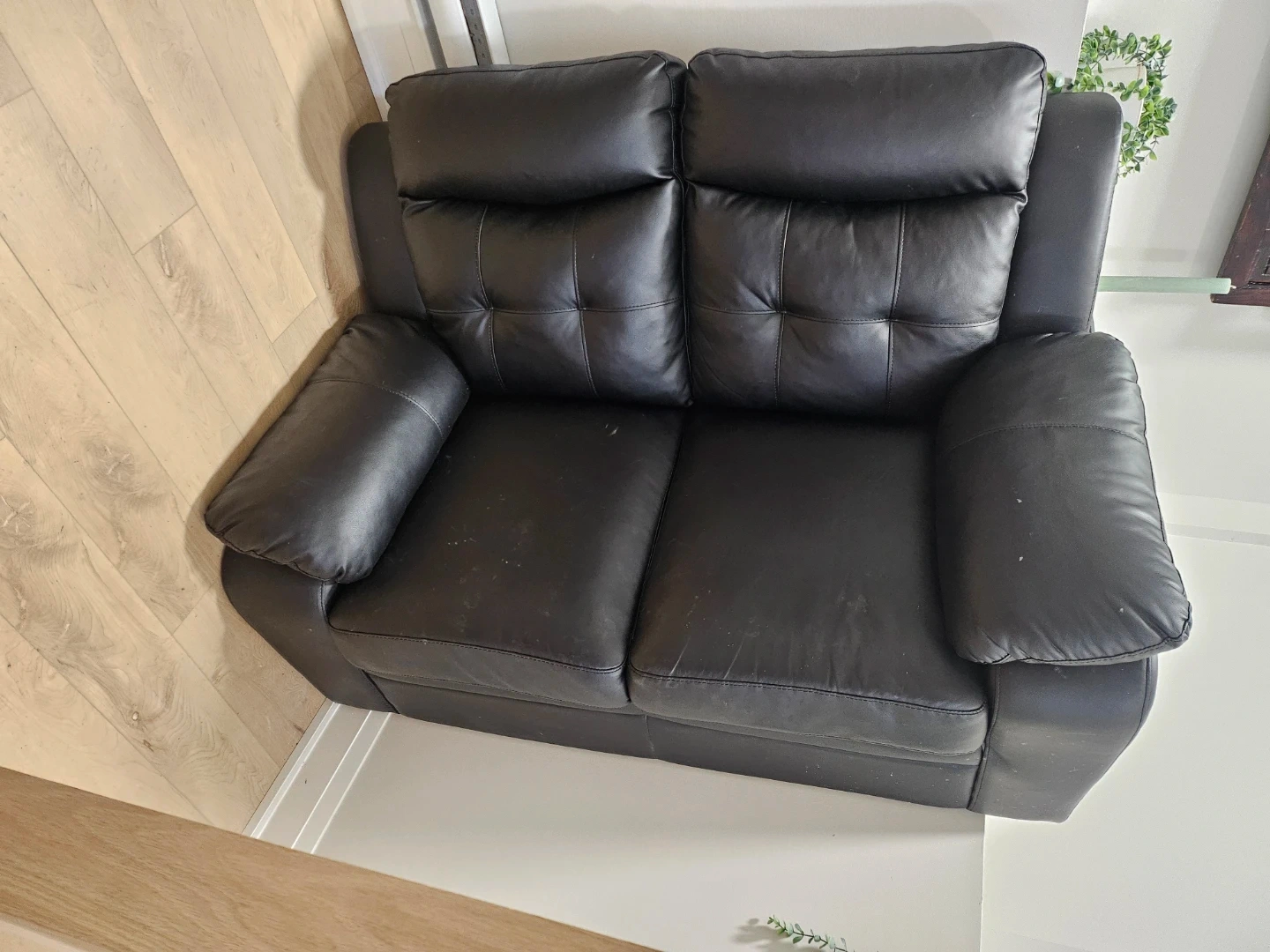 Selling a comfy black leather loveseat. It's in good condition and perfect for a small space or apartment. The cushions are soft and supportive, just not wanting dark furniture anymore. Barely sat in. Like new