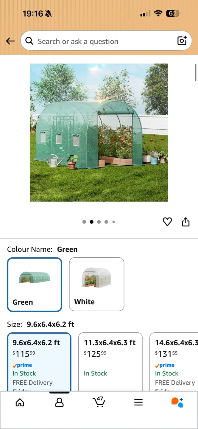This VEVOR walk-in tunnel greenhouse is 9.6x6.4x6.2 ft and comes in green. It features a galvanized steel frame and PE cover. The greenhouse has a roll-up zipper door and 6 windows for ventilation. Includes instruction manual, ropes, gloves, alien wrench, and ground stakes.