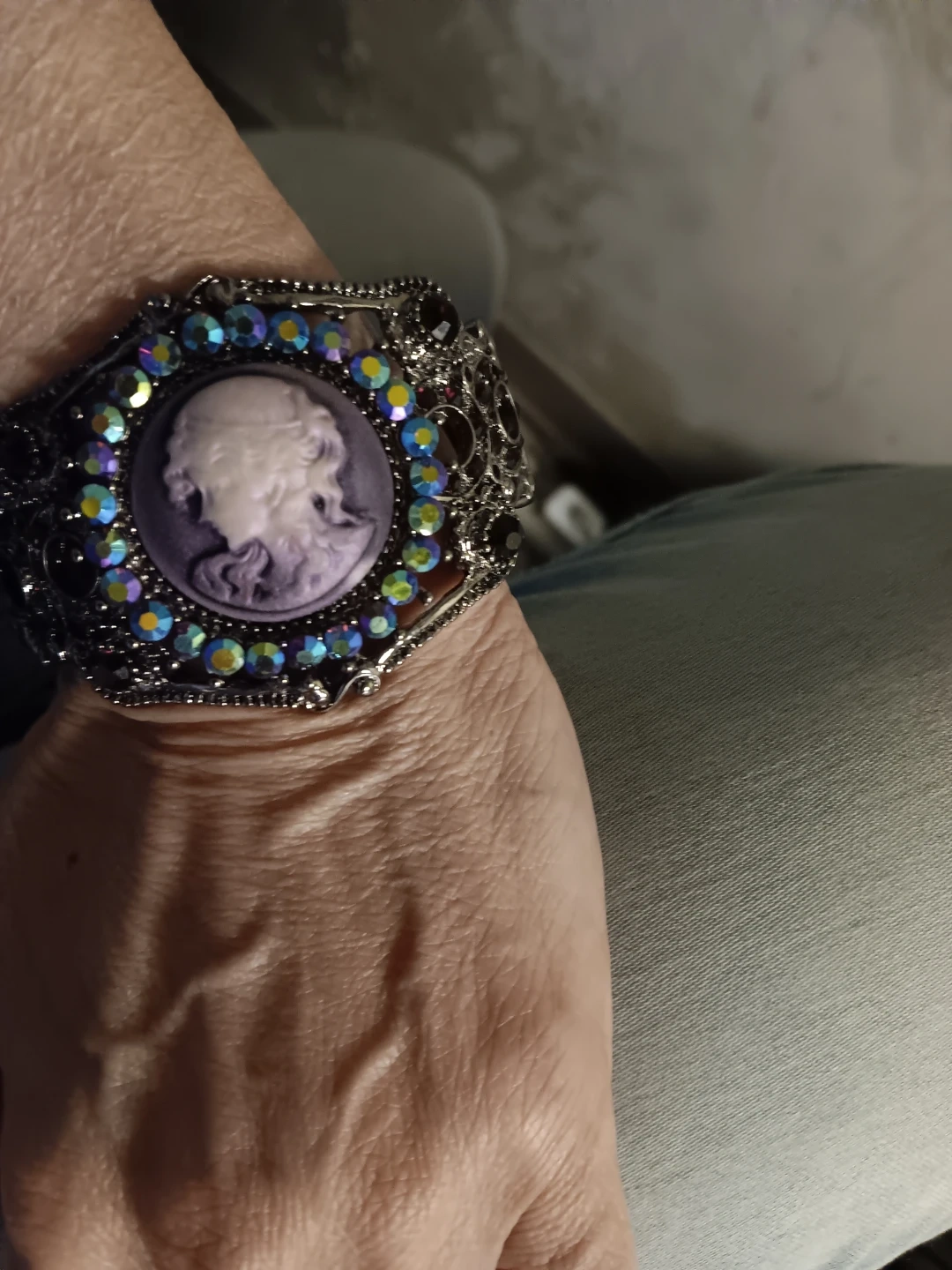 A vintage-inspired bangle bracelet featuring a purple cameo with a classic profile. It's adorned with colorful rhinestones around the center. The intricate metalwork adds an elegant touch.