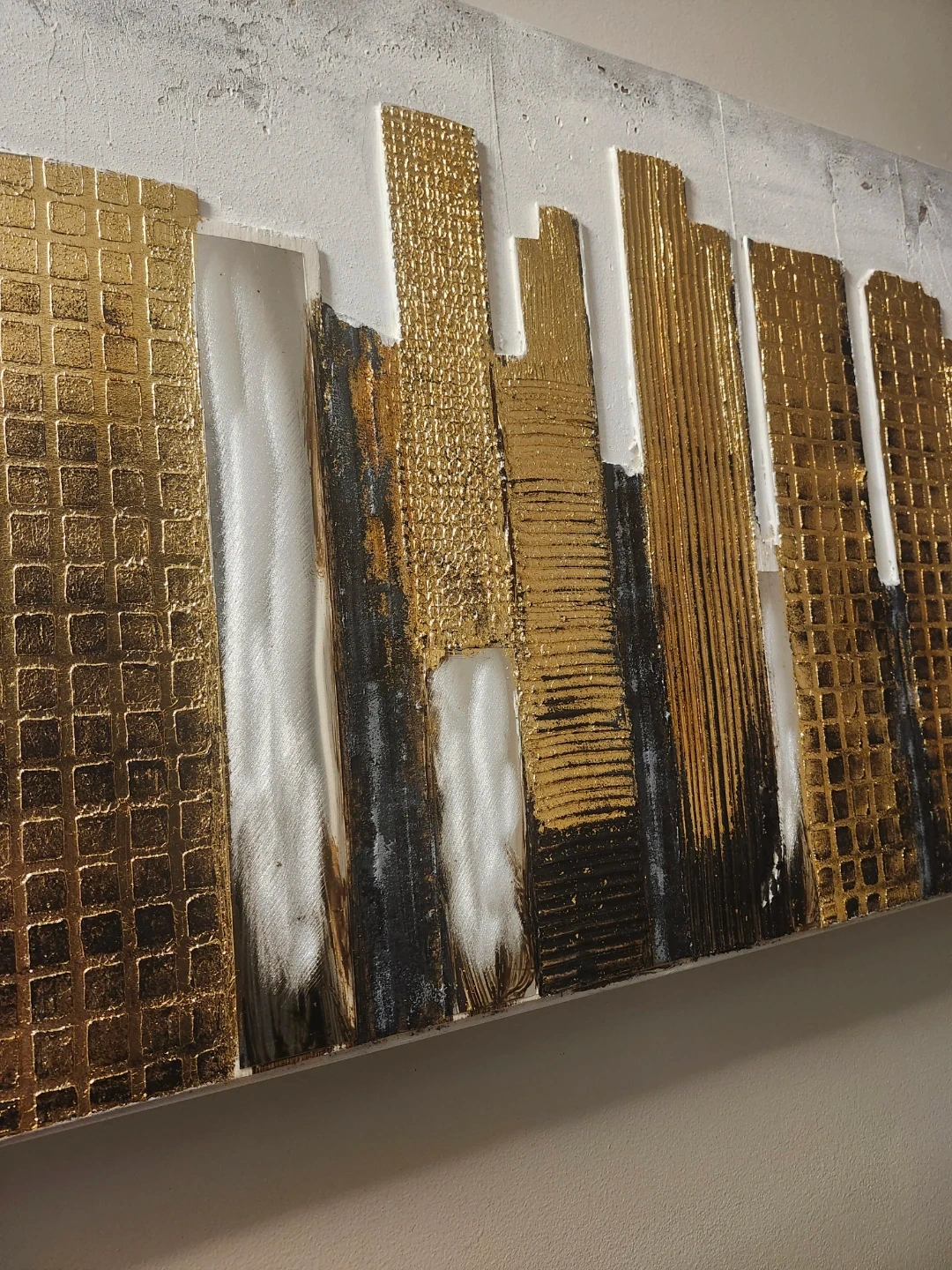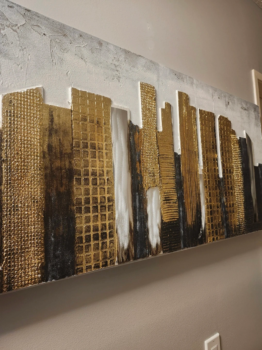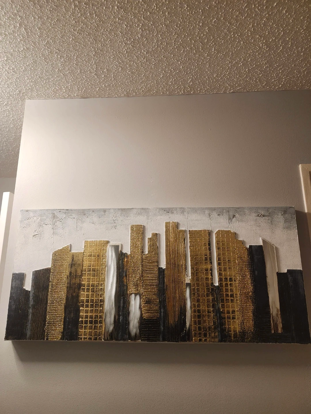 This textured wall art features a modern cityscape design with gold and black accents. It's a large canvas piece that adds a contemporary touch to any room. Great for living spaces or offices!