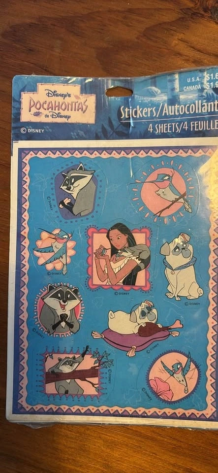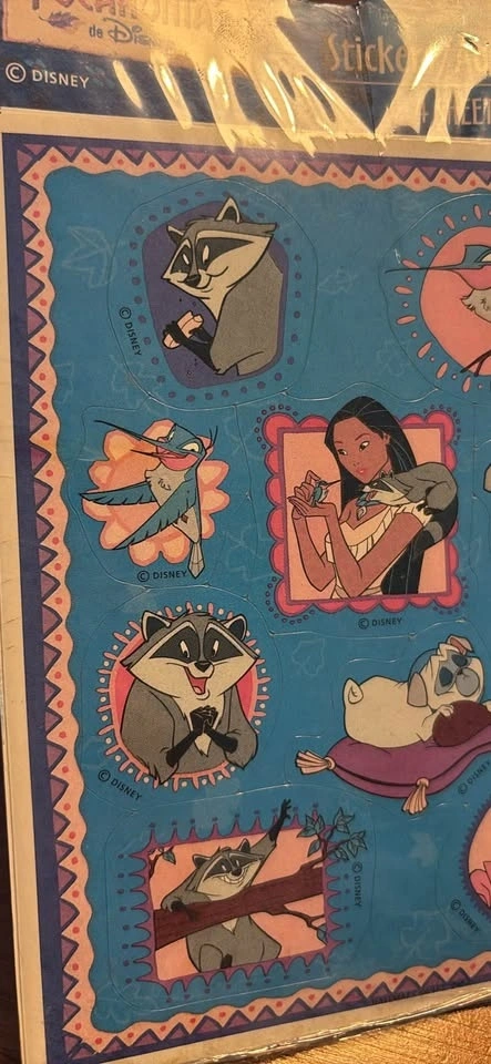 These stickers feature characters from the movie, including Pocahontas, Meeko the raccoon, and Flit the hummingbird.