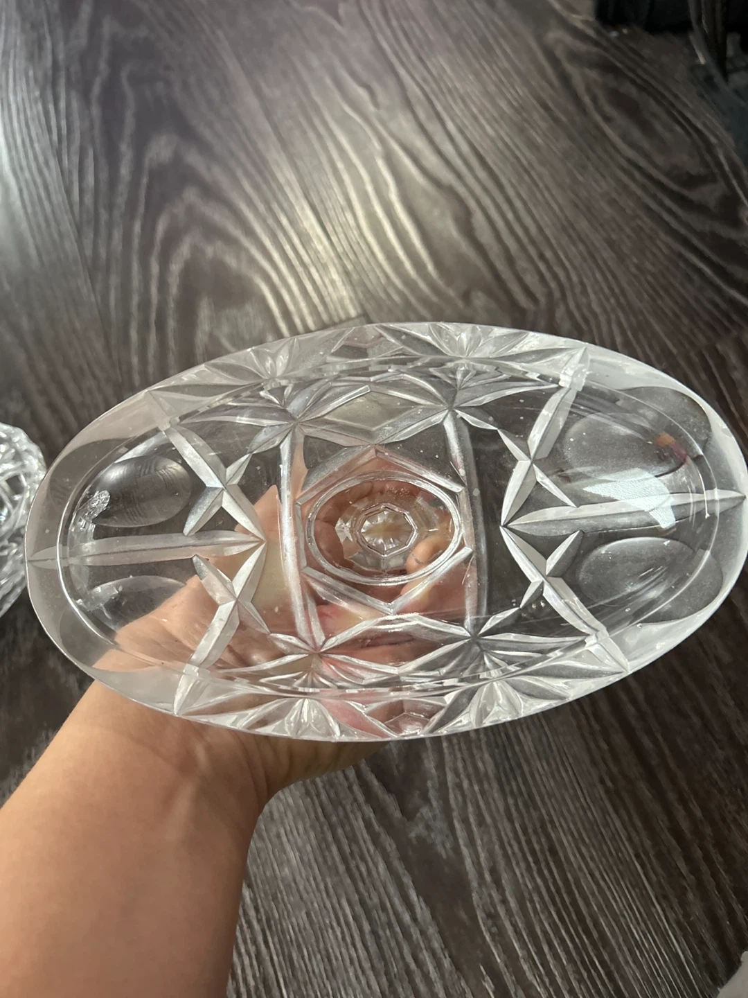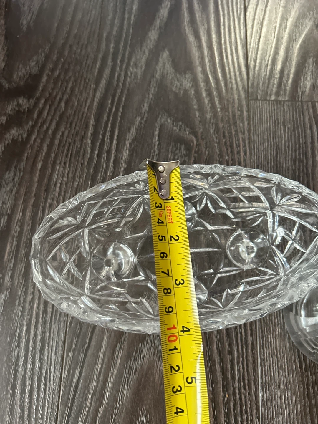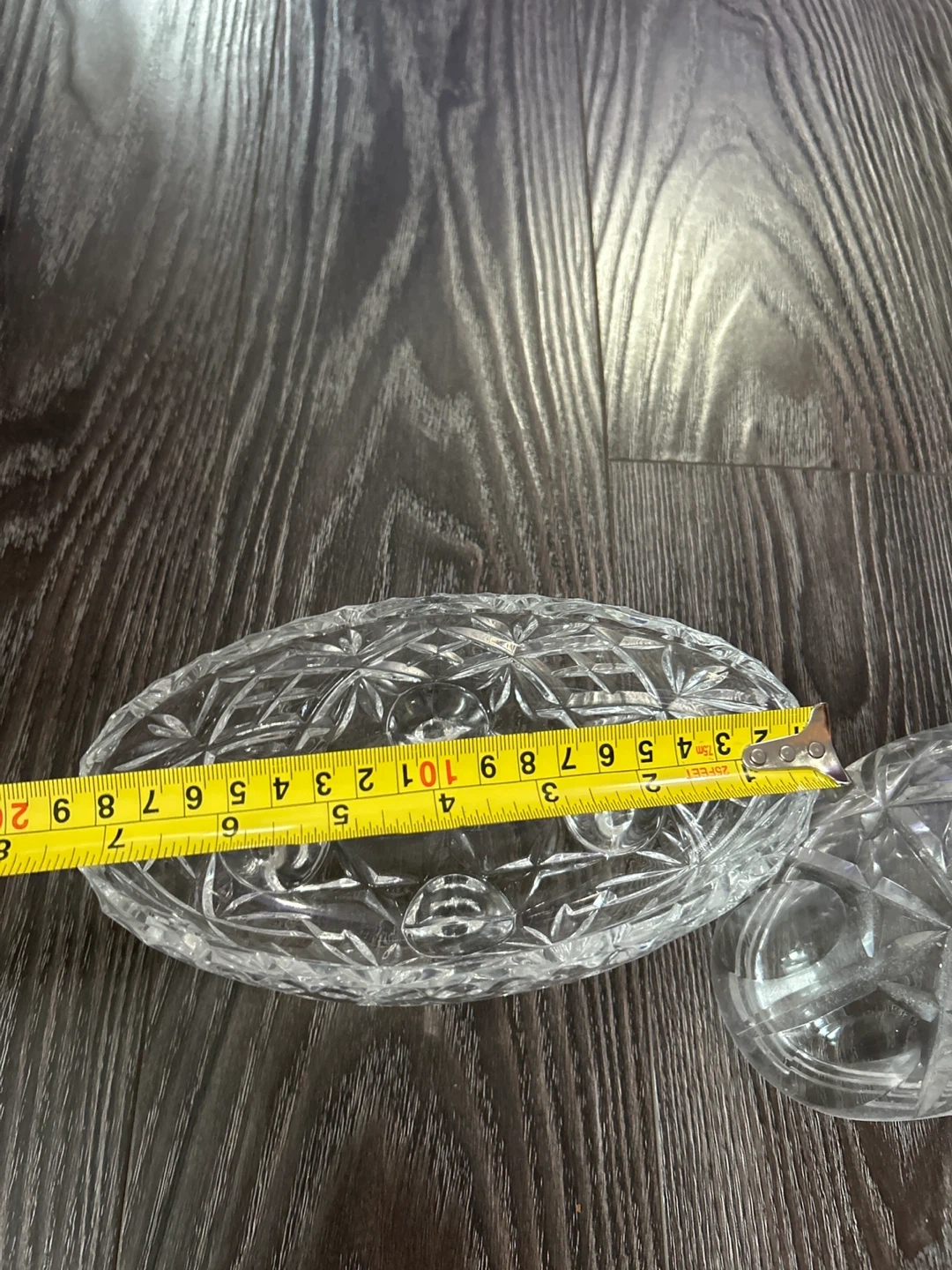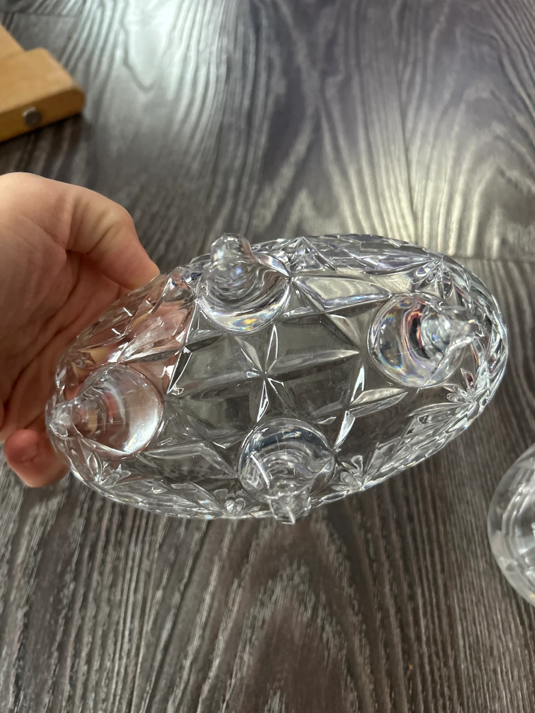 This is a beautiful glass candy dish with a lid and three small feet. It's perfect for serving candies or small treats at gatherings. The glass is clear and features a diamond-cut pattern. Cash or e-transfer only. No refunds.