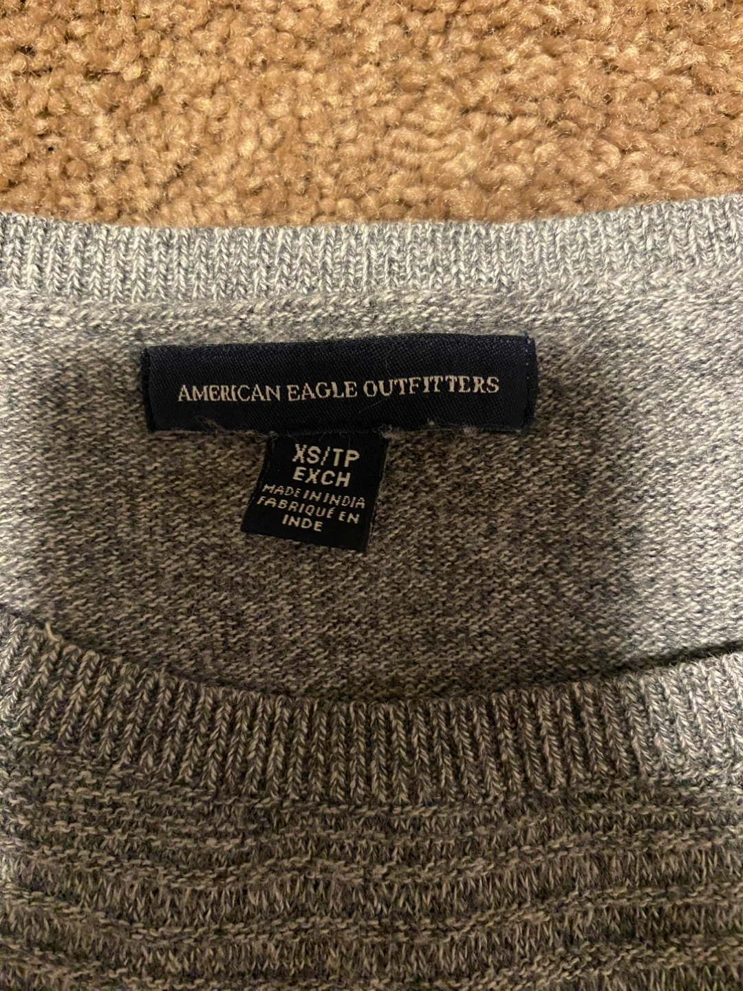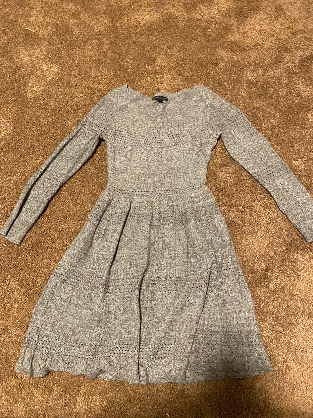 This is an American Eagle Outfitters knit sweater dress. It's grey with a long sleeve design. The dress is size XS/TP