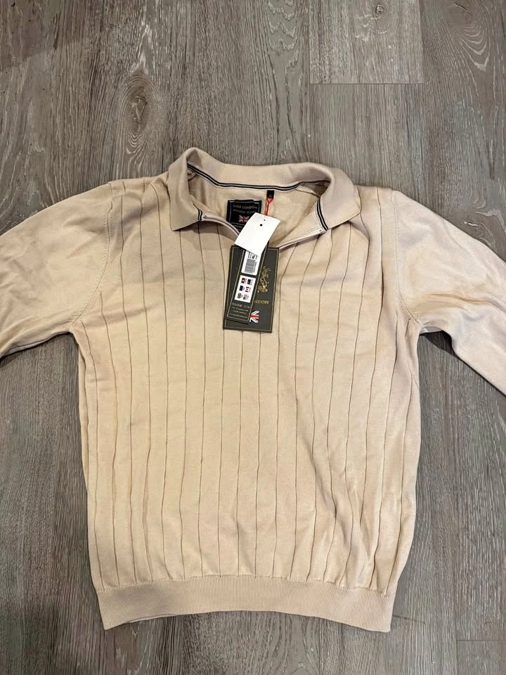 Brand new men's knit polo sweater with tags. Beige/sand color with a vertical ribbed knit design and a short zip/open collar. Soft, lightweight knit with ribbed hem and cuffs. Perfect for smart-casual outfits or layering in fall/spring.