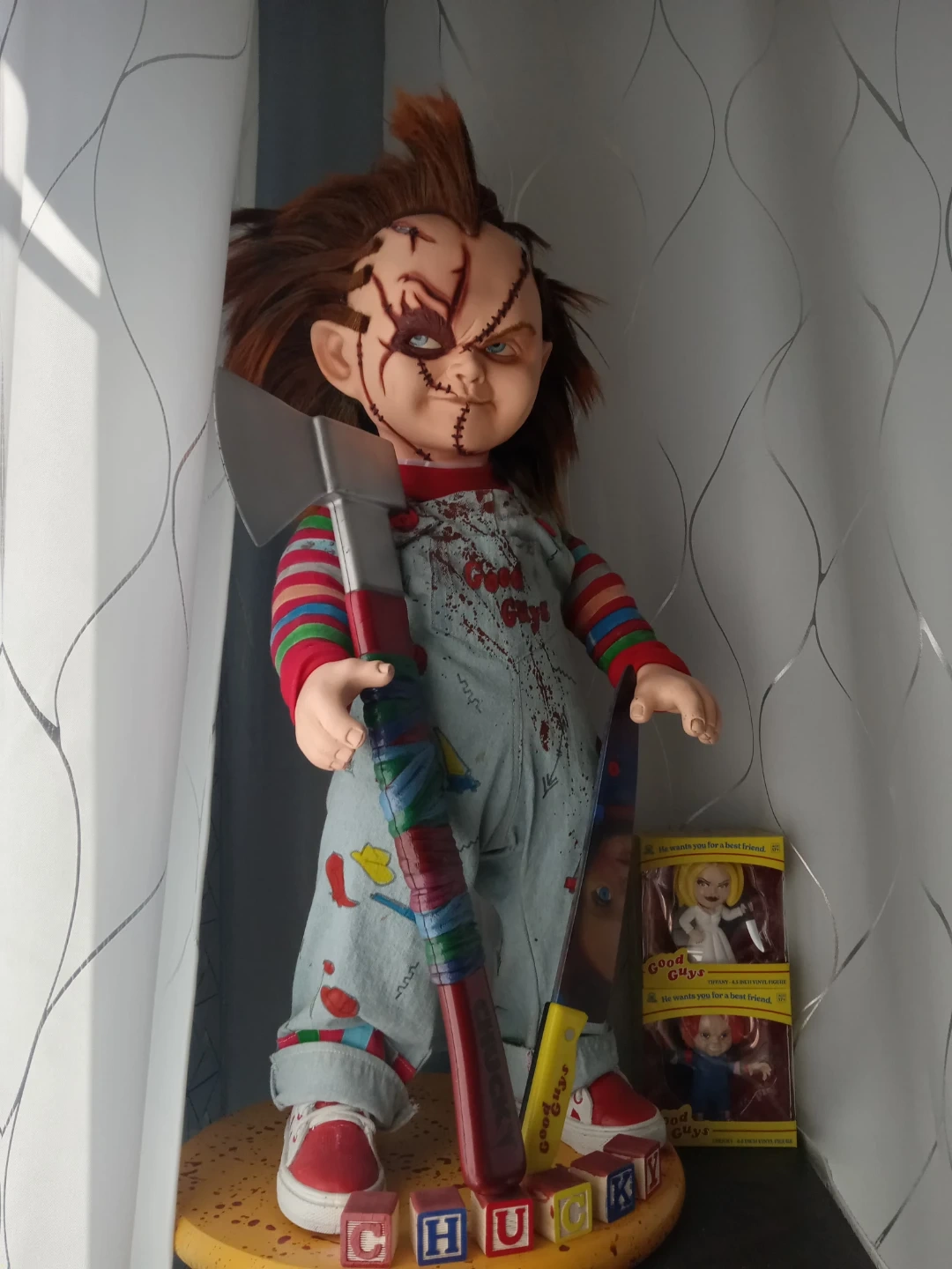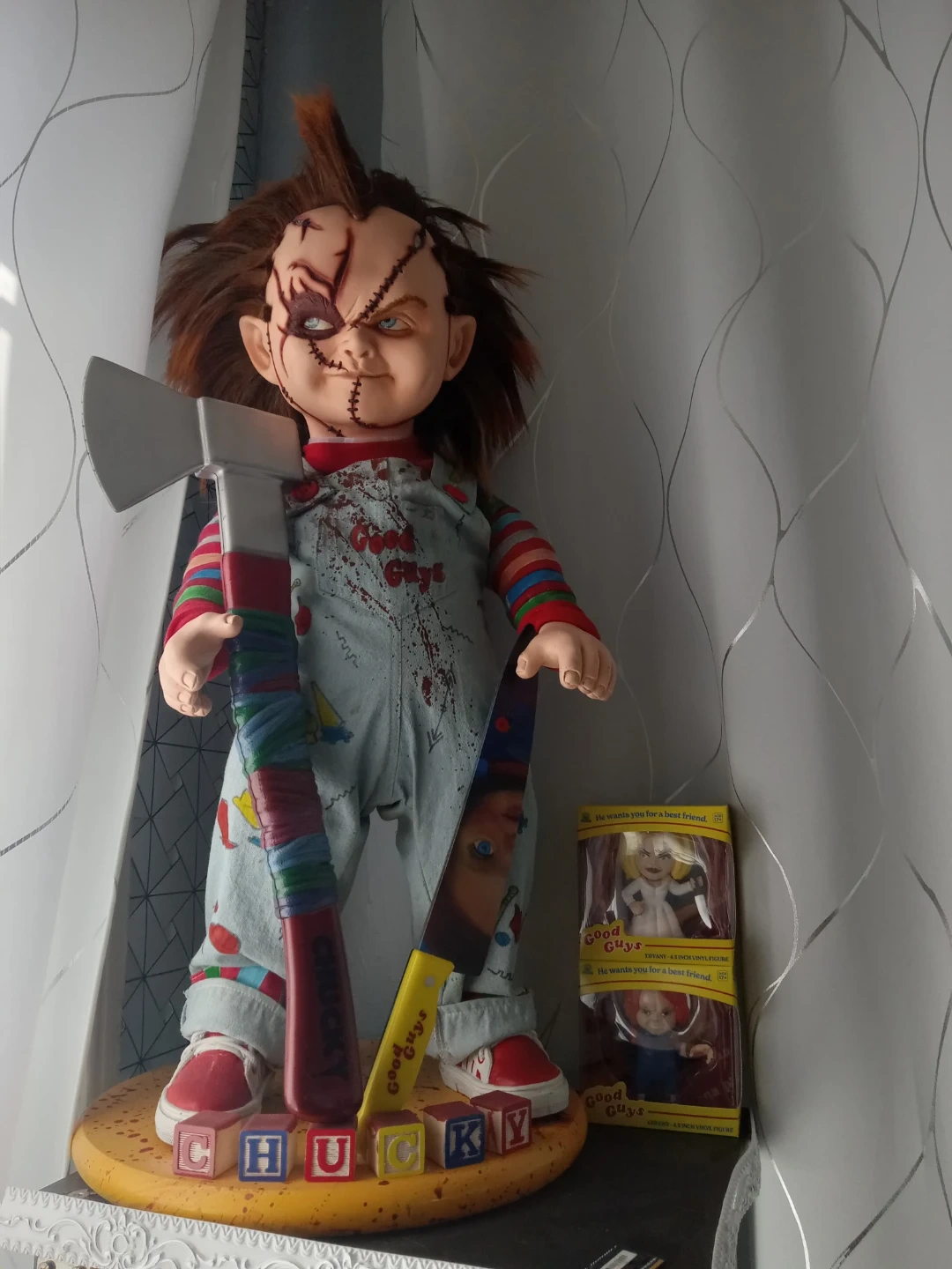 This is a really cool life size custom chucky doll stands at 30 inches tall purchased the doll alone a few years back from Argentina for $1300 made of strong fiberglass not the cheap Neca plastic comes with everything ing the pics a custom chucky stand and chucky qnd vride pops chuckies axe and knife and large scissors all this for $1160 Firm no offers no trades cash only pick up only in Redhook Brooklyn by Ikea please do not waste my time or yours