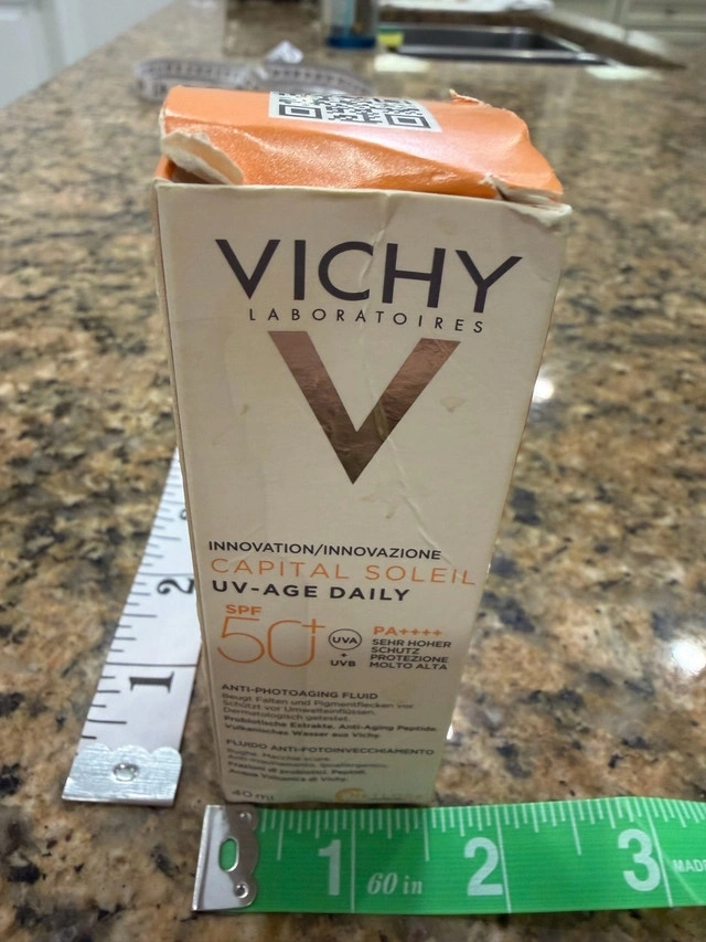 This is a Vichy Laboratoires Capital Soleil UV-Age Daily SPF 50 sunscreen with 40ml. It’s designed as an anti-photoaging fluid. The box is not in perfect condition, but the product is new and unopened. SPF: 50, Volume: 40ml, Type: Anti-Photoaging Fluid. If you're seeing this ad, the sunscreen is still available and ready to protect your skin from UV rays! Cash accepted.
