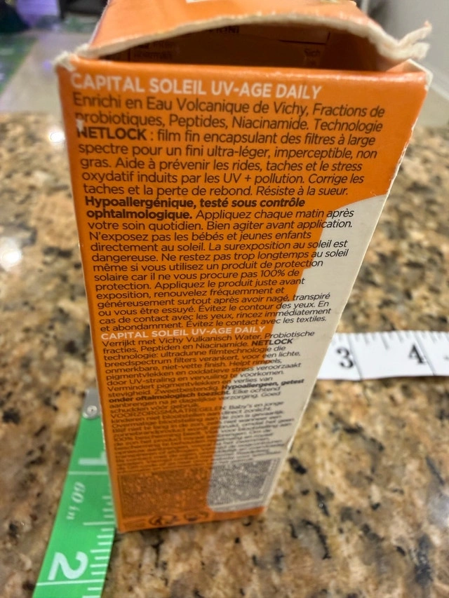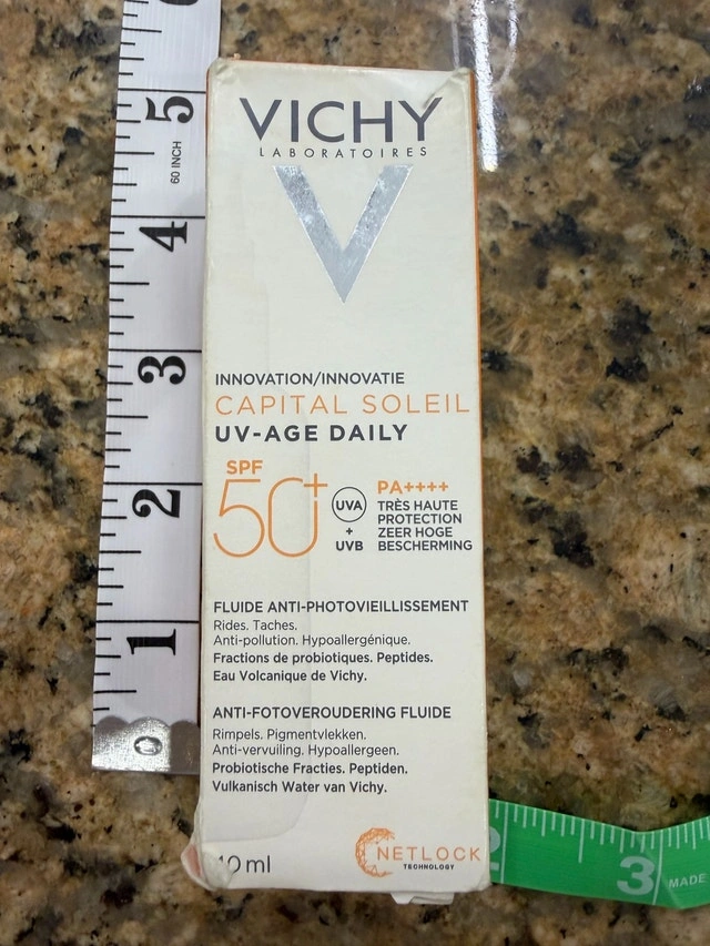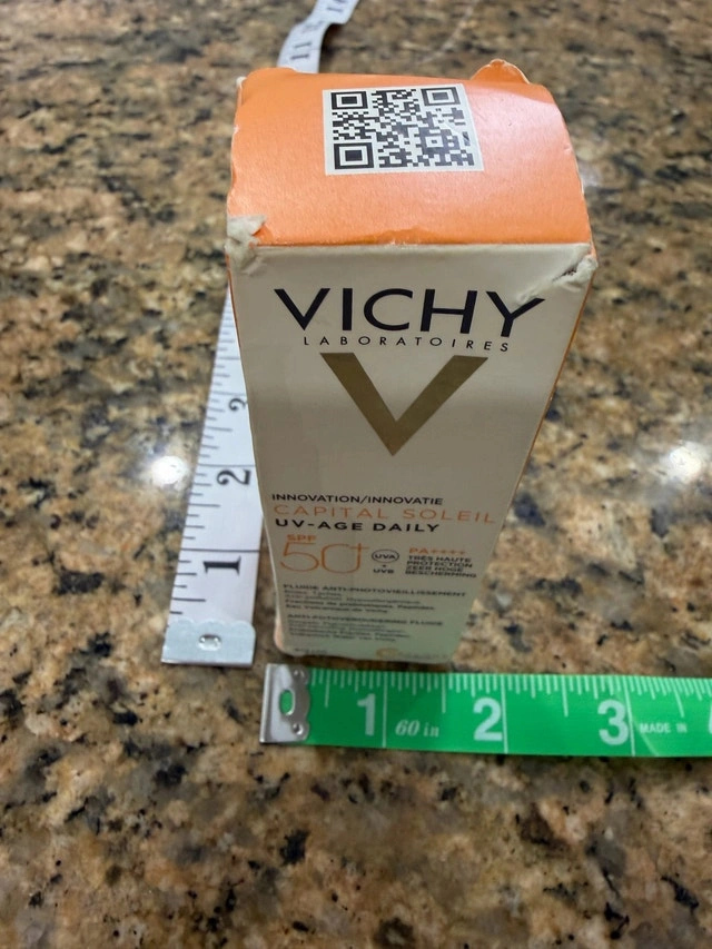 This is a Vichy Laboratoires Capital Soleil UV-Age Daily SPF 50 sunscreen with 40ml. It’s designed as an anti-photoaging fluid. The box is not in perfect condition, but the product is new and unopened. SPF: 50, Volume: 40ml, Type: Anti-Photoaging Fluid. If you're seeing this ad, the sunscreen is still available and ready to protect your skin from UV rays! Cash accepted.