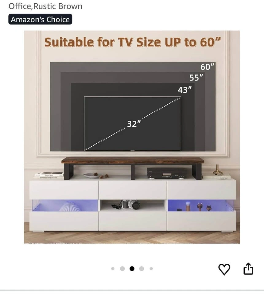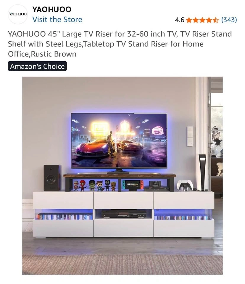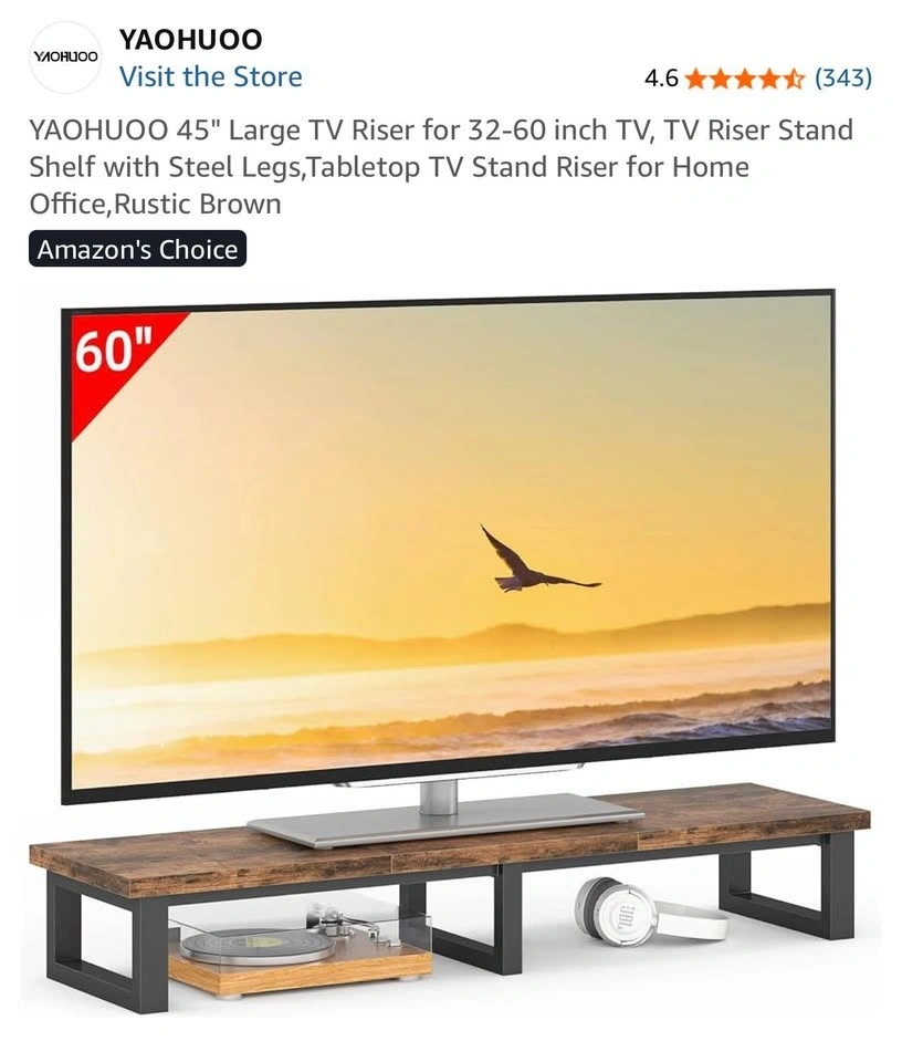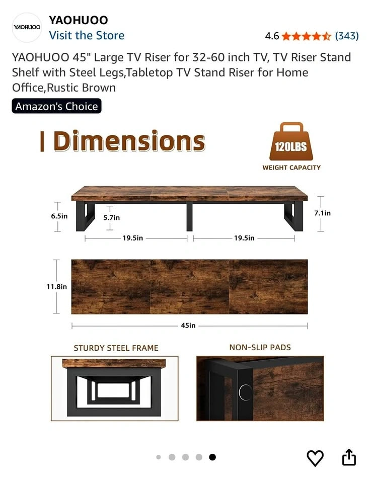 Rustic Brown YAOHUOO TV Riser Stand Shelf. Size: Large. Item weight: 7.71 kg. Style: Rustic. Assembly required: Yes. Dimensions: 45"L×11.8"W×7.1"H. This large TV riser stand can accommodate flat or curved TVs/Monitors up to 60 inches, or can be used as a stand for 2 monitors (up to 32 inches each). It's ideal for your living room, bedroom, or office. The stand features a heavy-duty steel frame with a weight capacity of up to 120lbs. Each leg has a non-slip mat to protect your desk from scratches. The space underneath the riser is perfect for a sound bar, gaming consoles (like PS4, Xbox), cable box, or satellite receiver, helping to keep your table tidy. It can also be used as a monitor stand for your computer, laptop, or printer. The TV shelf is easy to assemble by one person, with all parts and tools included.