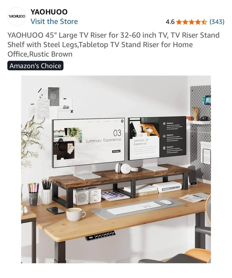 Rustic Brown YAOHUOO TV Riser Stand Shelf. Size: Large. Item weight: 7.71 kg. Style: Rustic. Assembly required: Yes. Dimensions: 45"L×11.8"W×7.1"H. This large TV riser stand can accommodate flat or curved TVs/Monitors up to 60 inches, or can be used as a stand for 2 monitors (up to 32 inches each). It's ideal for your living room, bedroom, or office. The stand features a heavy-duty steel frame with a weight capacity of up to 120lbs. Each leg has a non-slip mat to protect your desk from scratches. The space underneath the riser is perfect for a sound bar, gaming consoles (like PS4, Xbox), cable box, or satellite receiver, helping to keep your table tidy. It can also be used as a monitor stand for your computer, laptop, or printer. The TV shelf is easy to assemble by one person, with all parts and tools included.