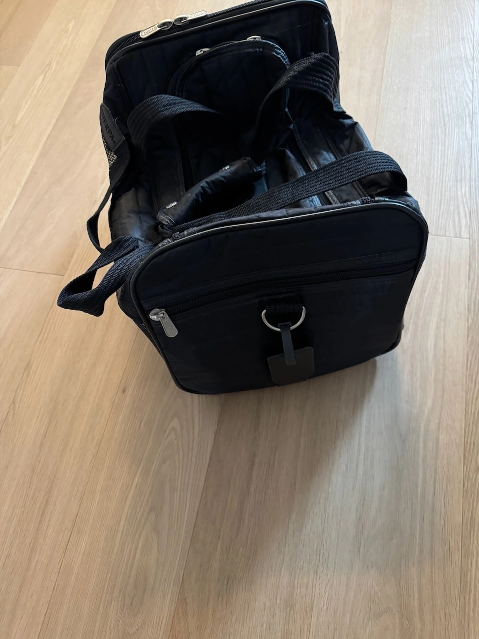 Sherpa pet carrier. Nylon with metal Fram and mesh sides. Fits under airline seats.