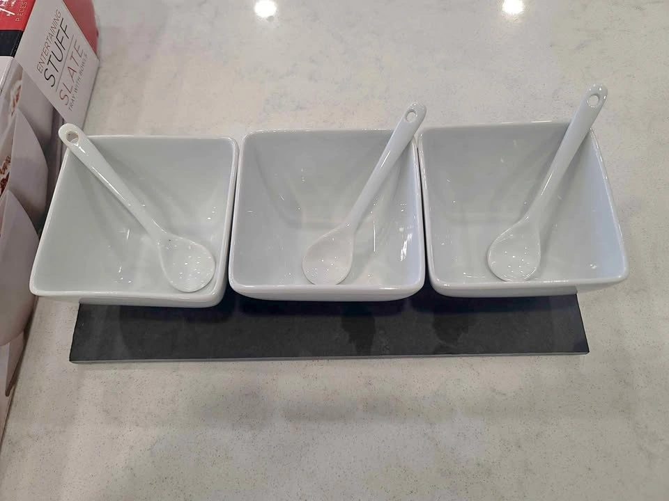 Elegant entertaining serving set perfect for serving snacks, dips, sauces, chutneys, nuts, or appetizers.