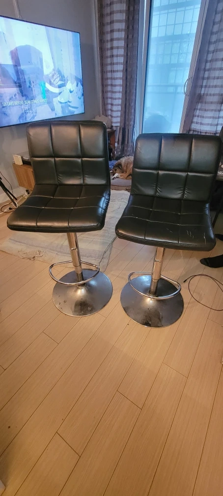 FREE set of two black swivel bar stools. As you can see from the photos, there are some signs of wear and tear on the seats. Otherwise, they're still sturdy and functional! Located downtown, Cityplace.