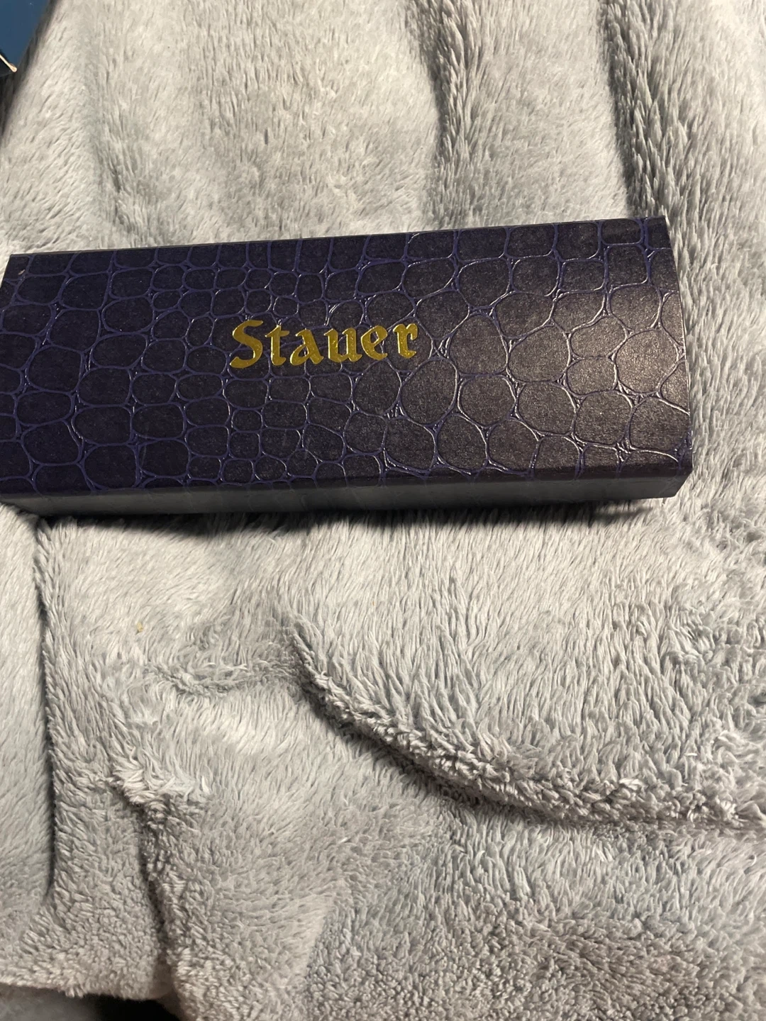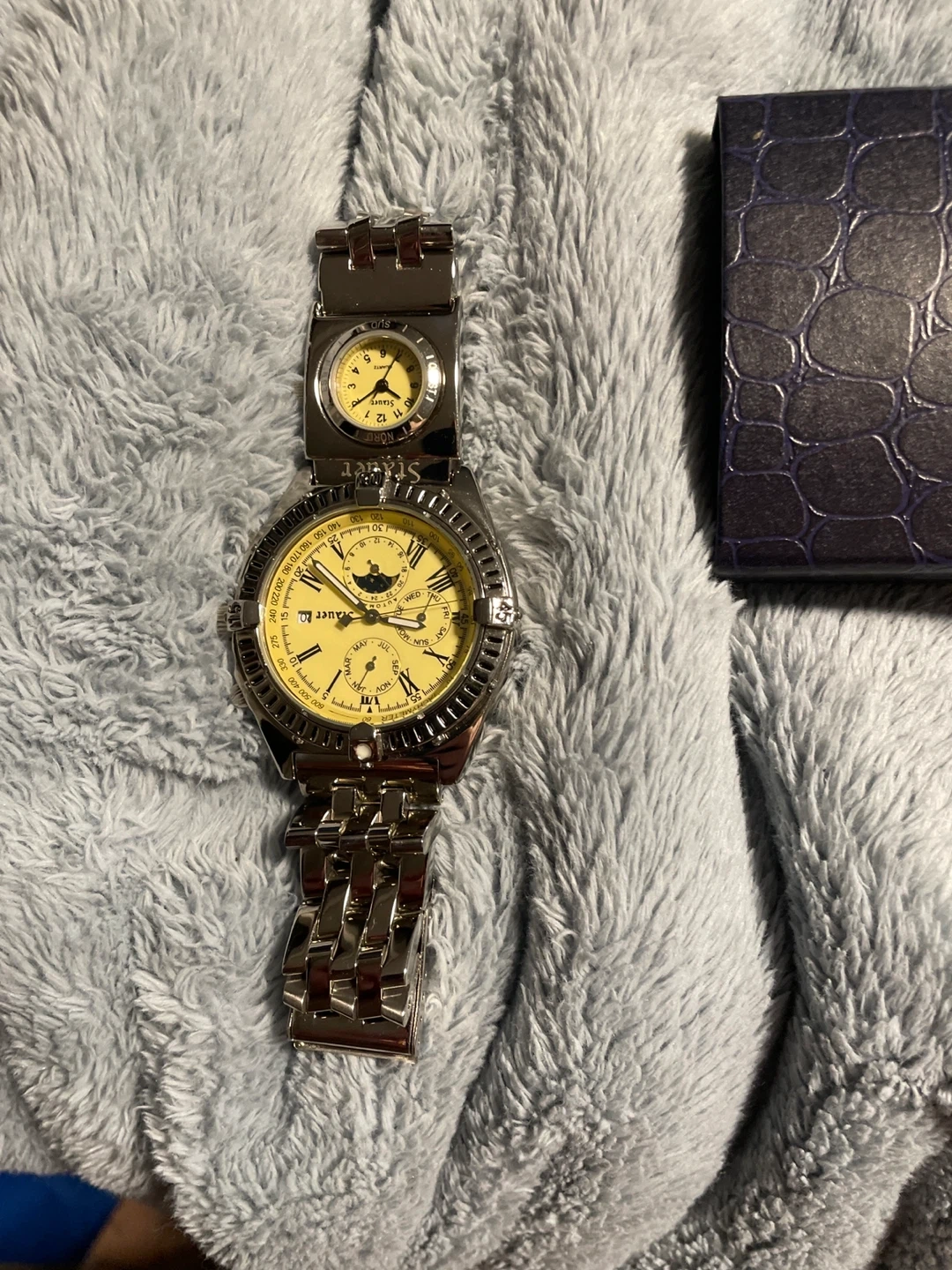 Selling a Stauer wristwatch that features a moon phase complication. It comes with the original box. The watch has a silver-tone finish and an intricate band design. It's in great condition and ready for a new wrist!