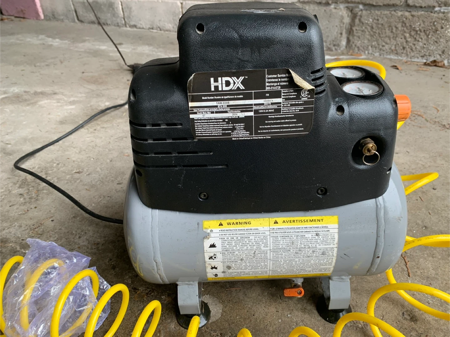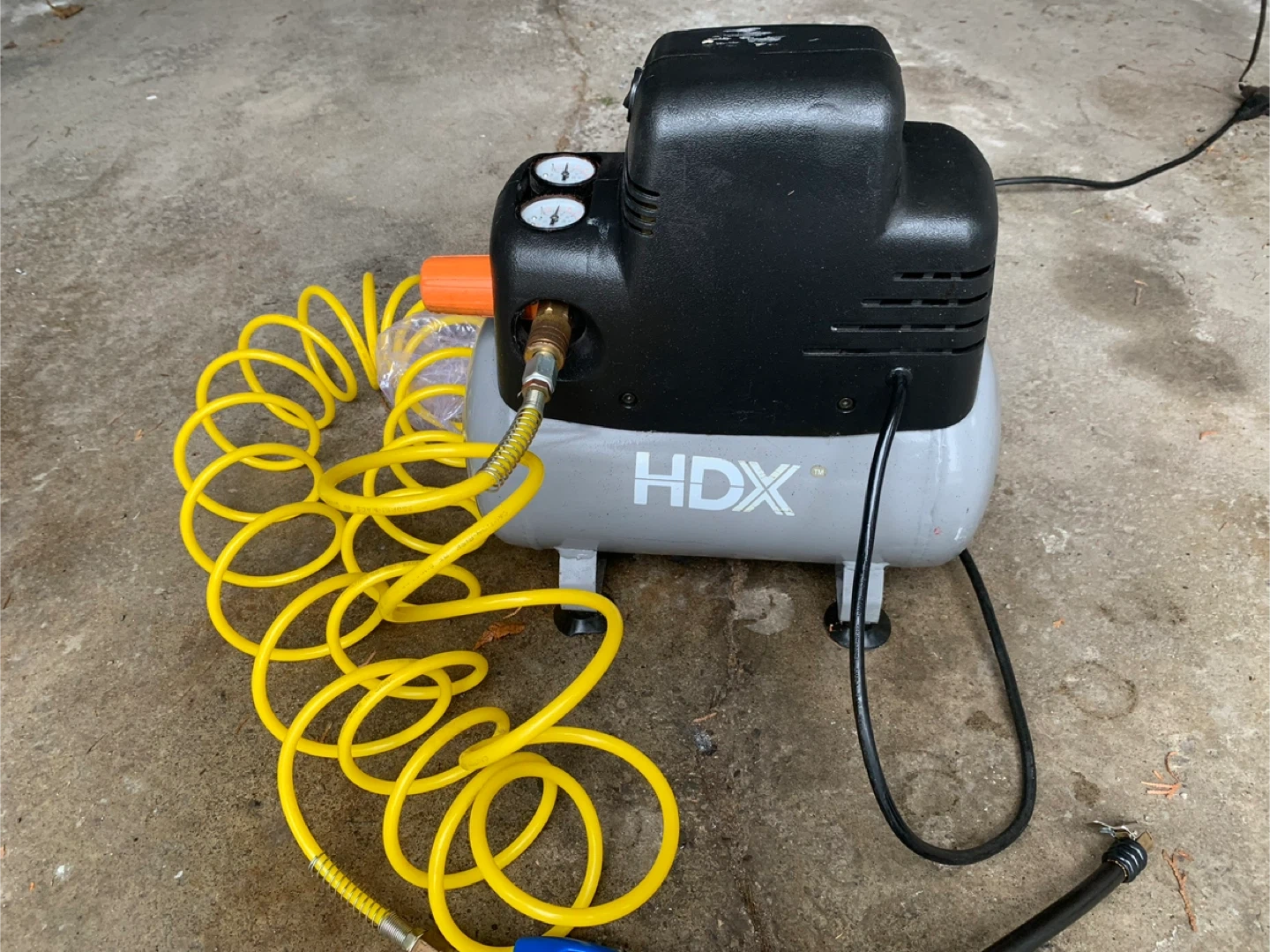 This is an HDX 2.0-gallon air compressor. It includes a coiled air hose and a tire inflator with a gauge. The compressor has two gauges to monitor pressure.