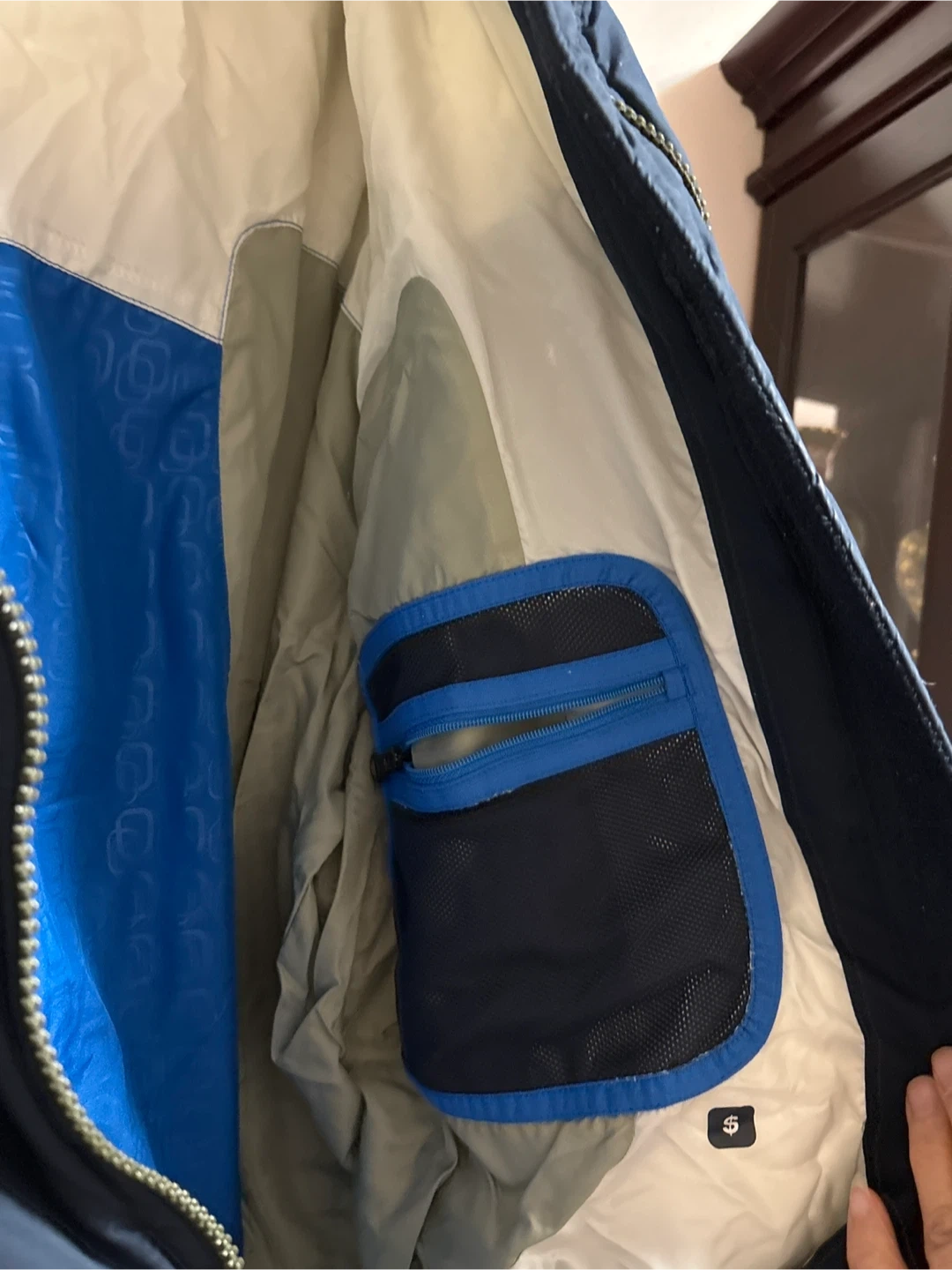 This is a navy blue Nike puffer jacket. It's made for warmth and comfort. The inside has a bright blue lining with a handy zippered pocket. Only wear it a few times