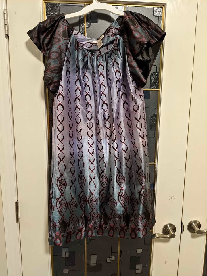 Such a pretty dress with lots of color and very unique. You can wear it flowy and free, or put a belt on to show more of your figure. It says Large, but I would say you could definitely wear it if you're more of a medium.