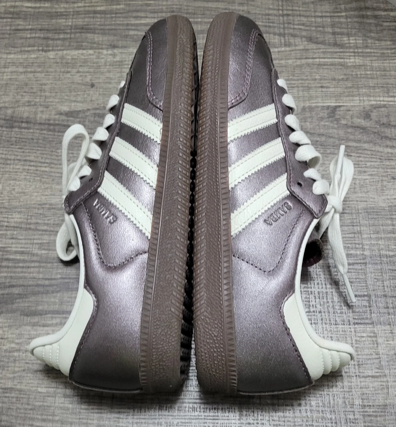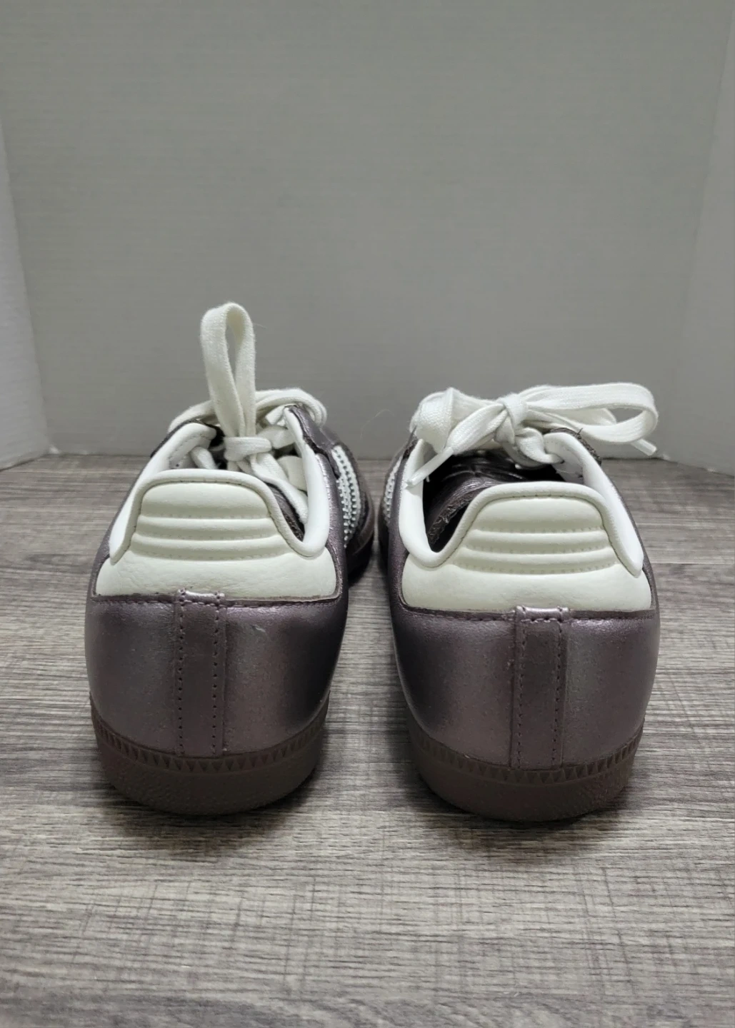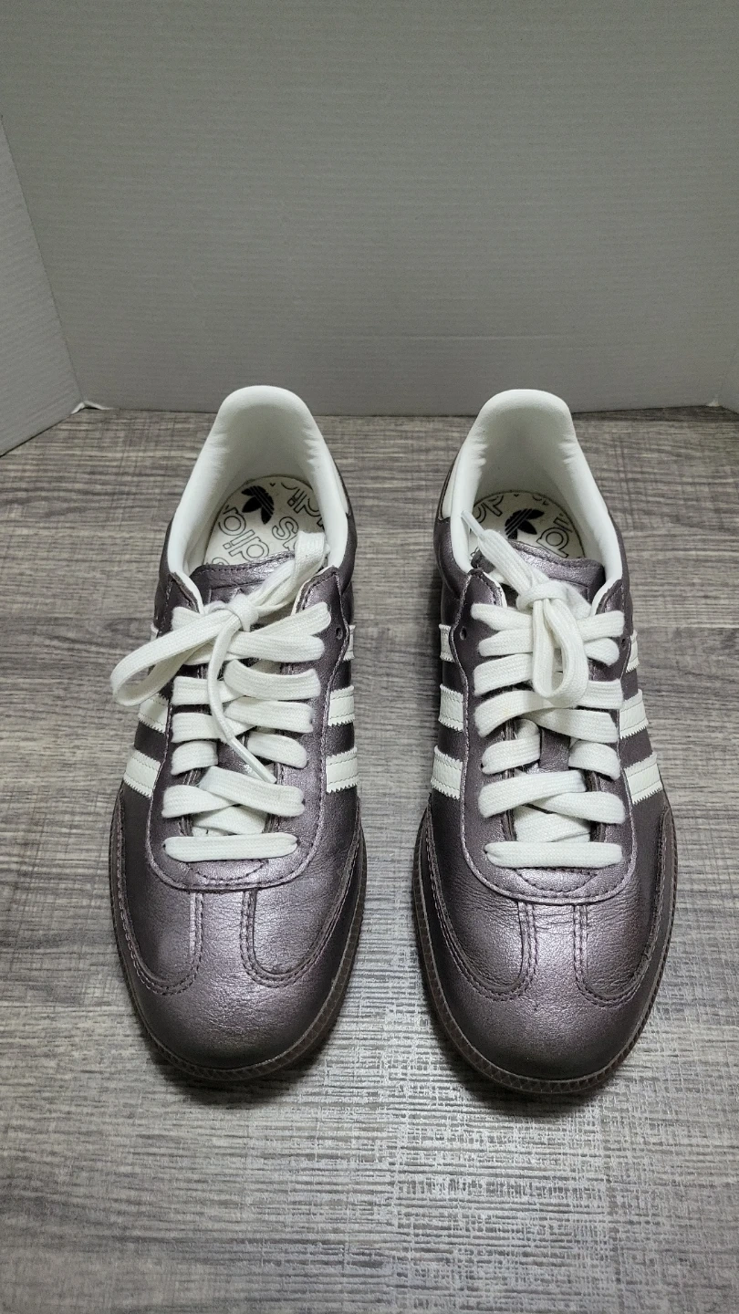 Classic Adidas Samba sneakers in a metallic pewter finish. They feature the iconic three stripes and comfortable interior. These shoes are stylish and versatile!