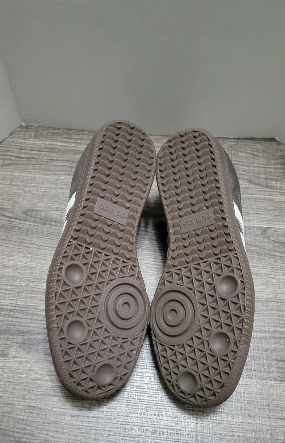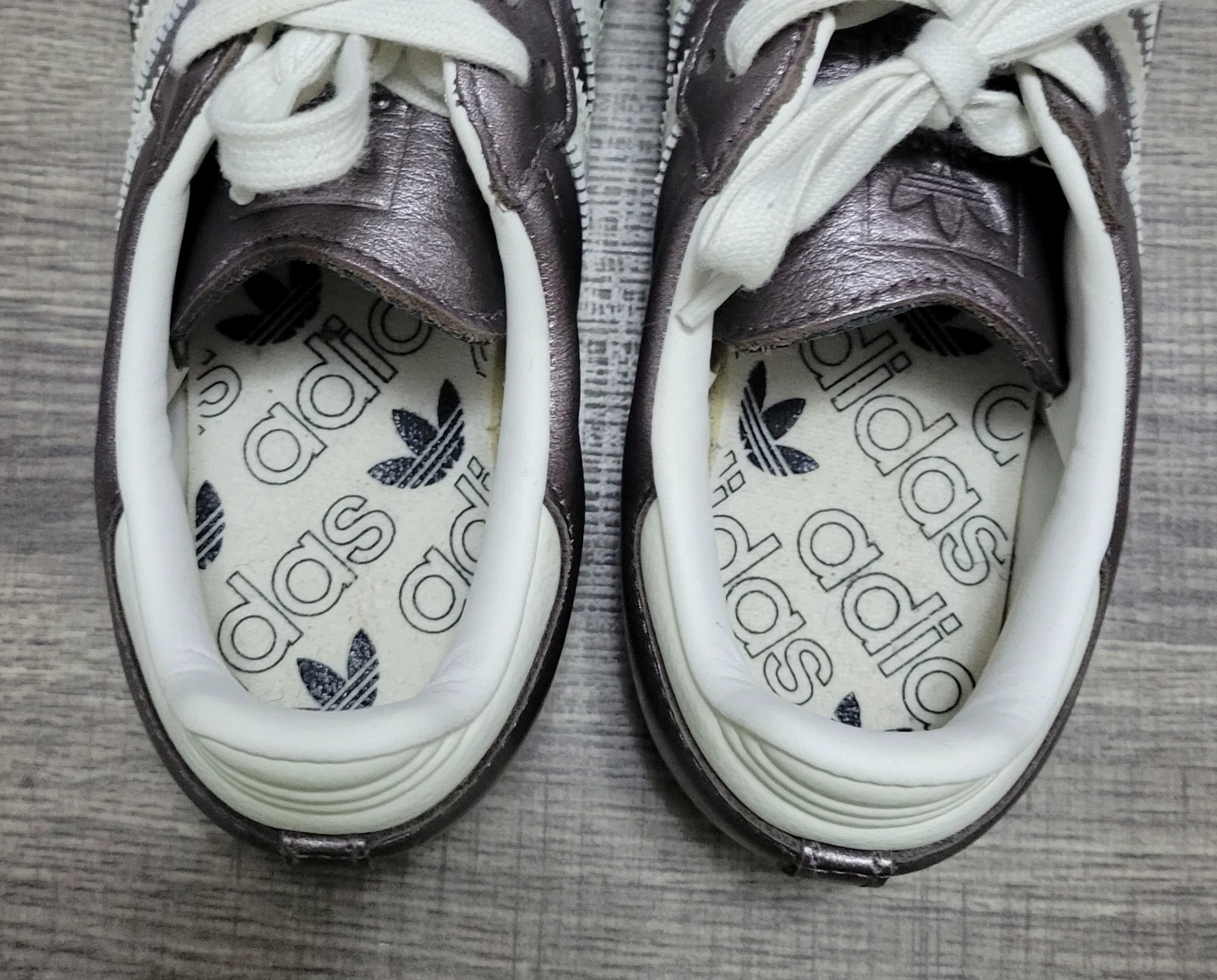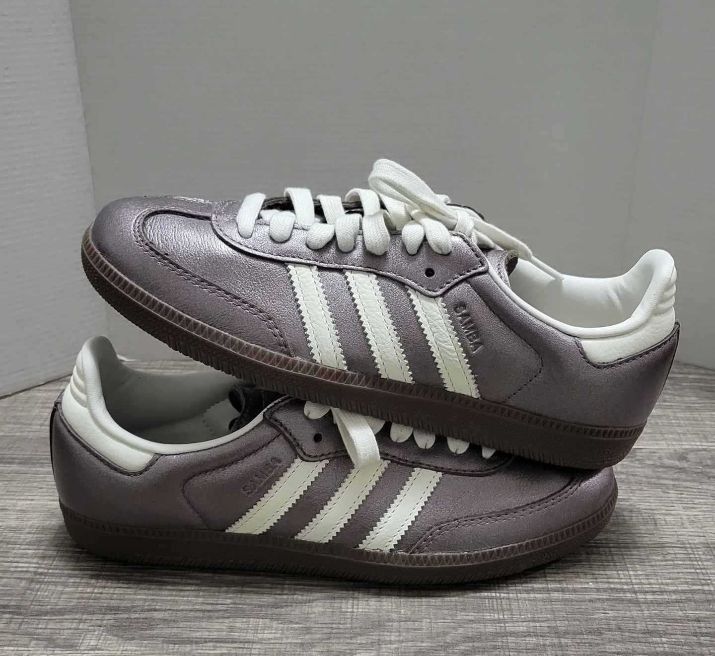 Classic Adidas Samba sneakers in a metallic pewter finish. They feature the iconic three stripes and comfortable interior. These shoes are stylish and versatile!