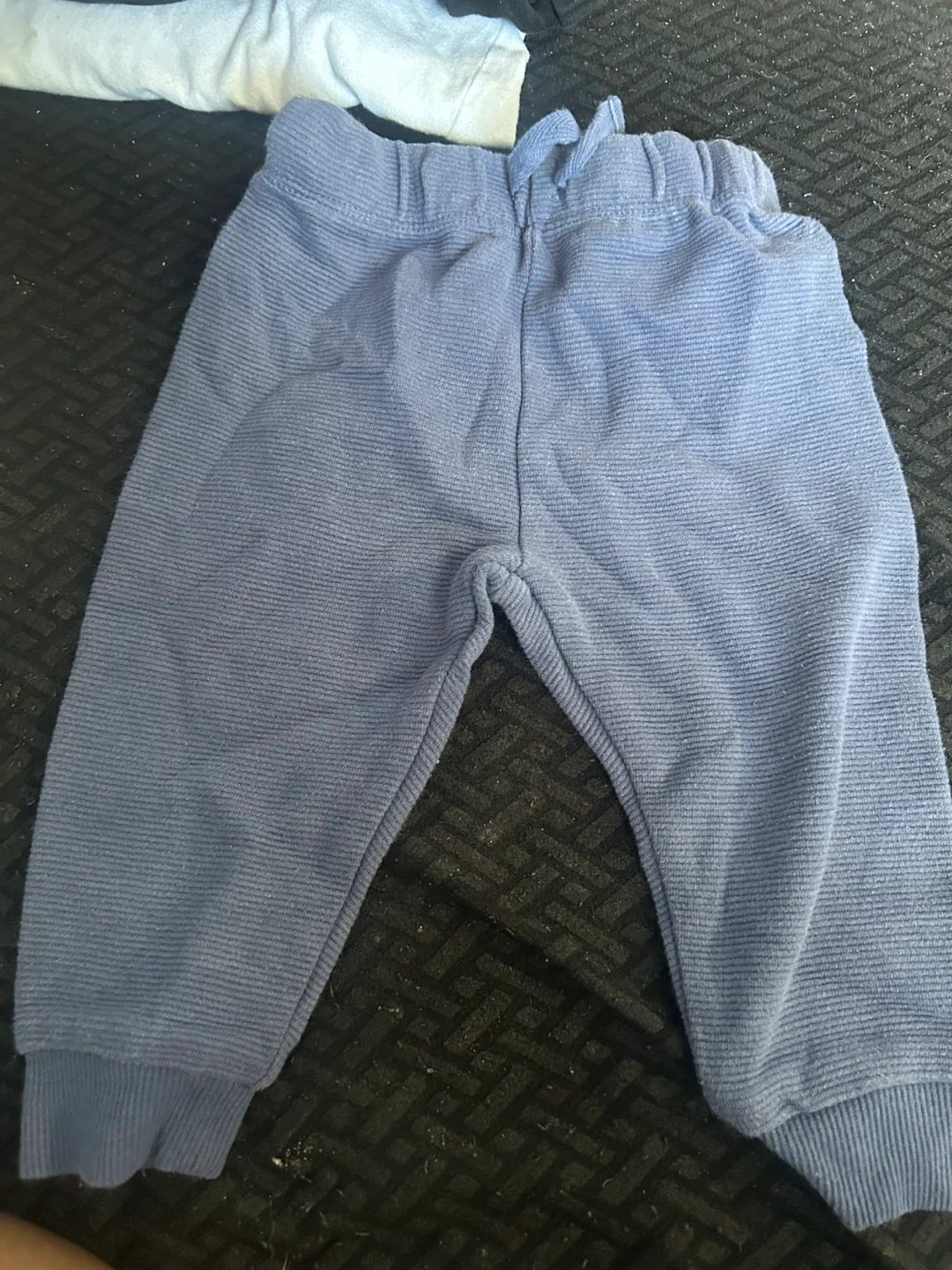 Comfy blue jogger pants for babies. They're made from a soft, ribbed material with an elastic waistband and drawstring. Perfect for crawlers and early walkers! Size 9 m