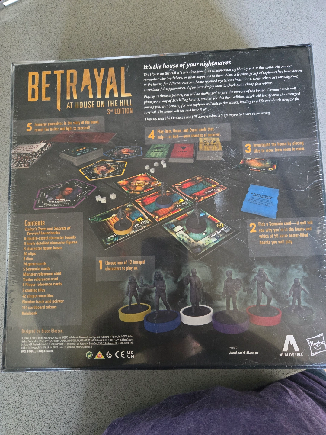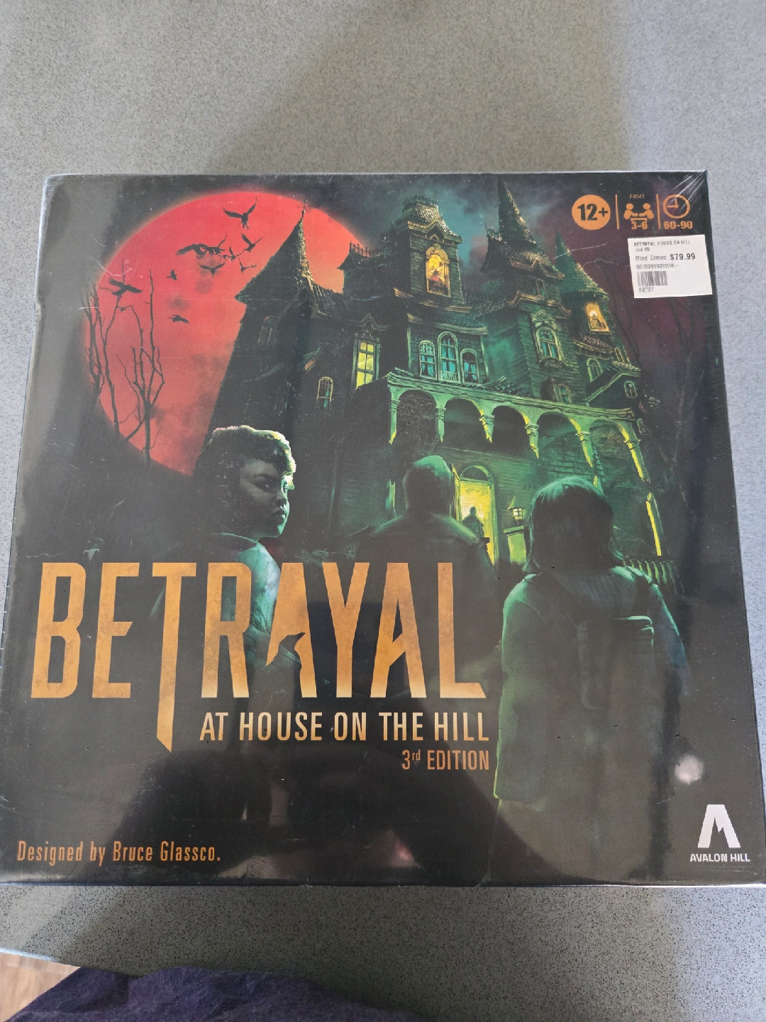 Selling a brand new, sealed copy of Betrayal at House on the Hill 3rd Edition! This spooky board game is perfect for game nights with friends and family. It's designed by Bruce Glassco and published by Avalon Hill/Hasbro. Originally retailed for $79.99, it's suitable for ages 12+ and plays 3-6 players. Get ready for a thrilling adventure in a haunted house!