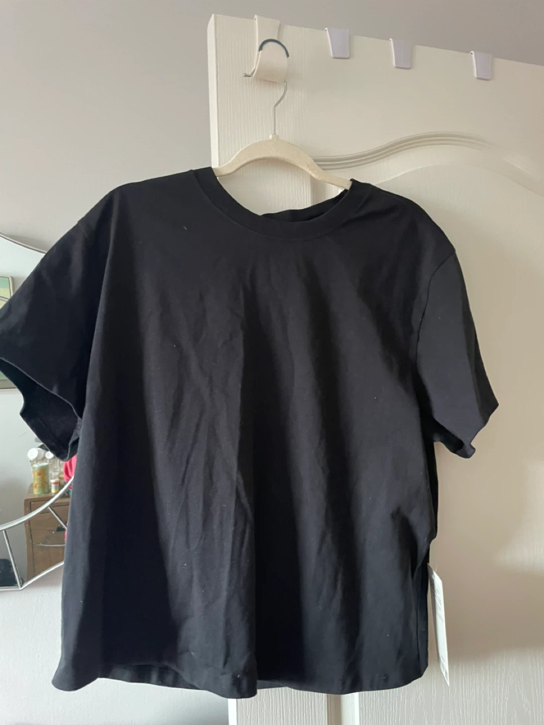 This is a Lululemon Relaxed-Fit Cotton Jersey T-Shirt in black, size 14. It's made from 100% cotton. This heavyweight t-shirt is designed for everyday wear and features a relaxed fit.