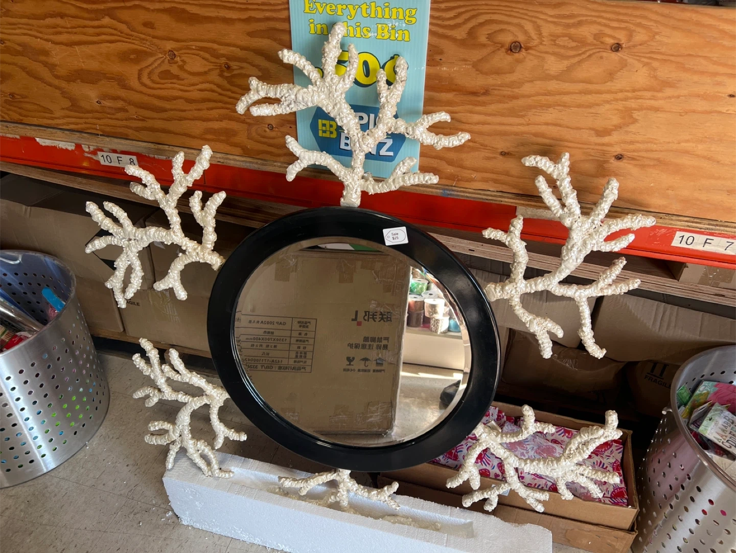 Here's a unique round mirror with a black frame, decorated with coral-like accents! It's a fun and stylish piece to add some flair to your space