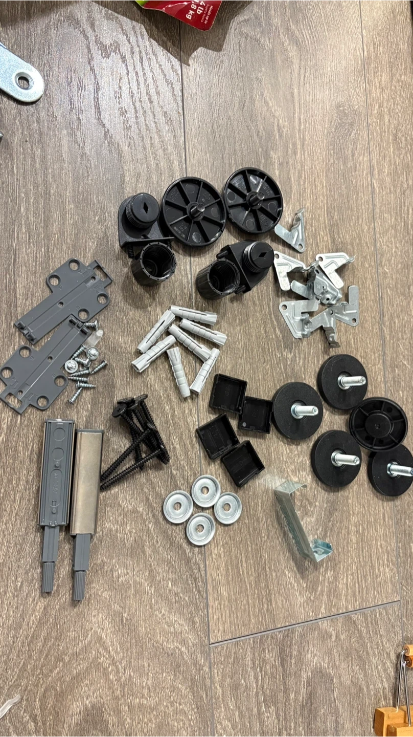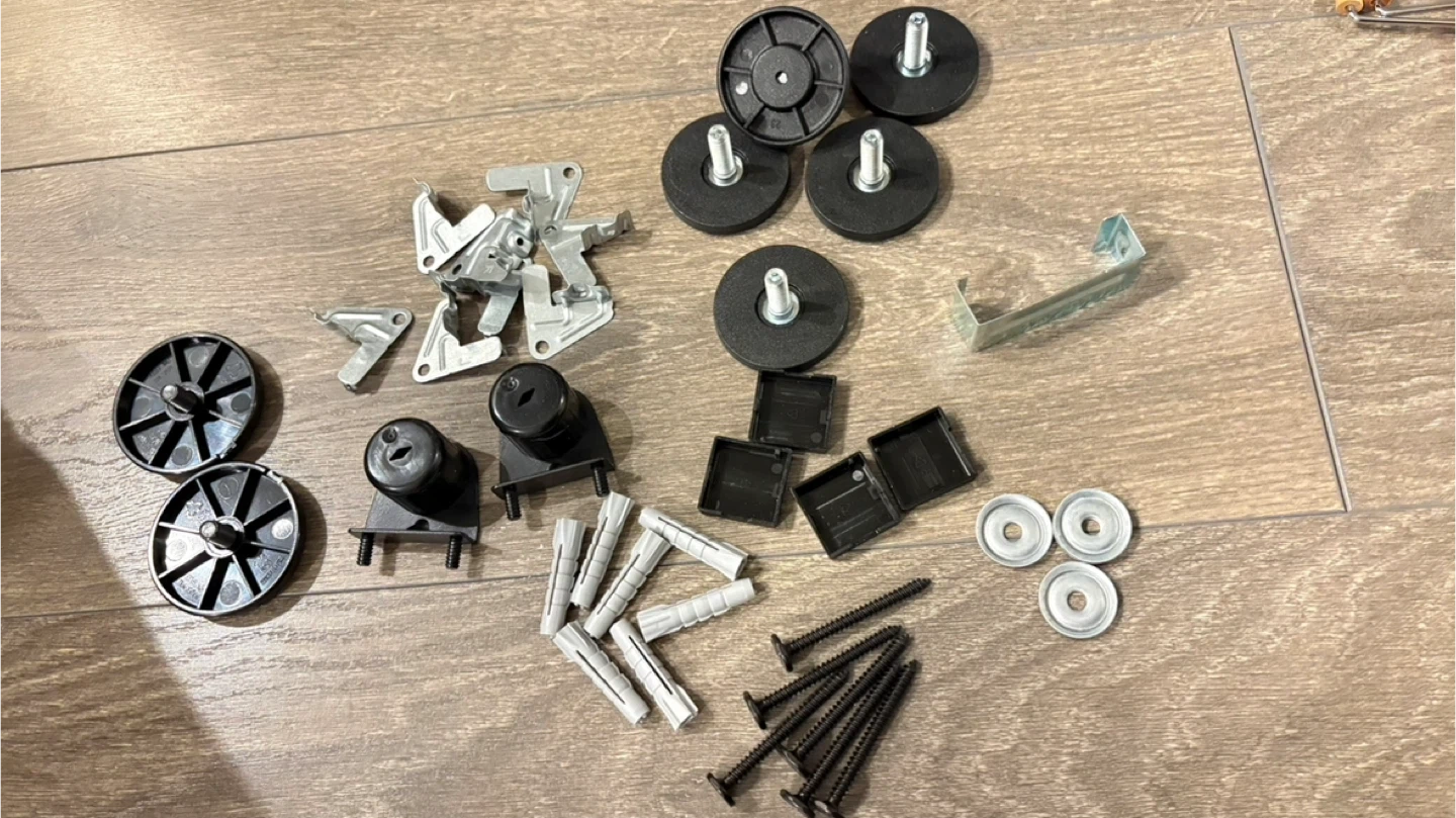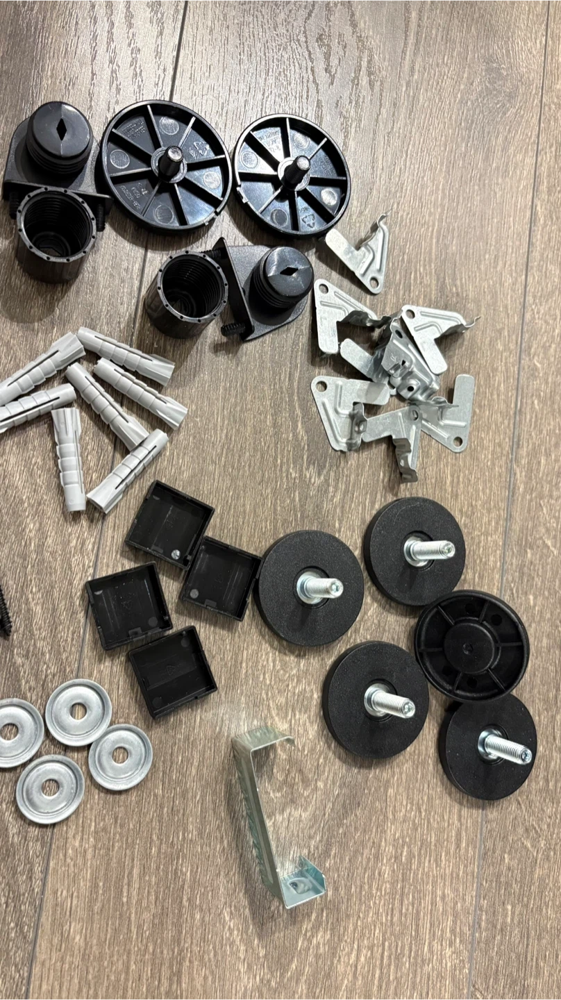 This kit includes various hinges, mounting plates, screws, wall plugs, and feet. All components are designed for IKEA BESTÅ units. It's made of metal and plastic.