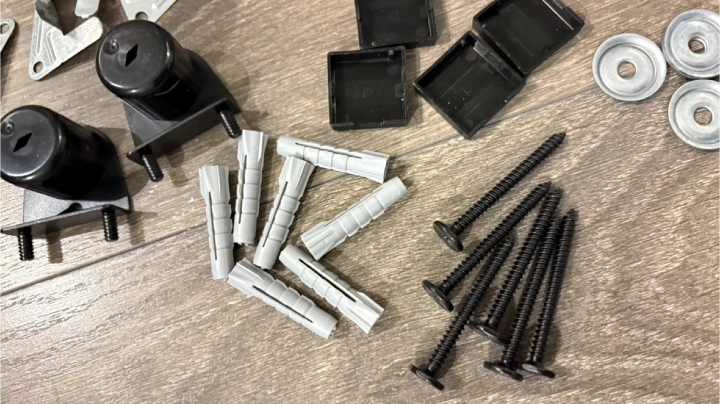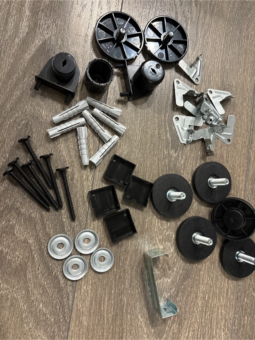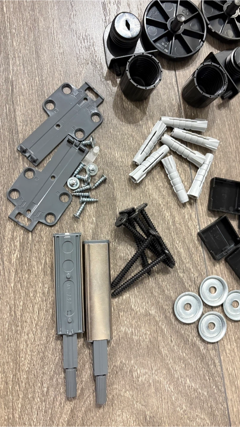 This kit includes various hinges, mounting plates, screws, wall plugs, and feet. All components are designed for IKEA BESTÅ units. It's made of metal and plastic.