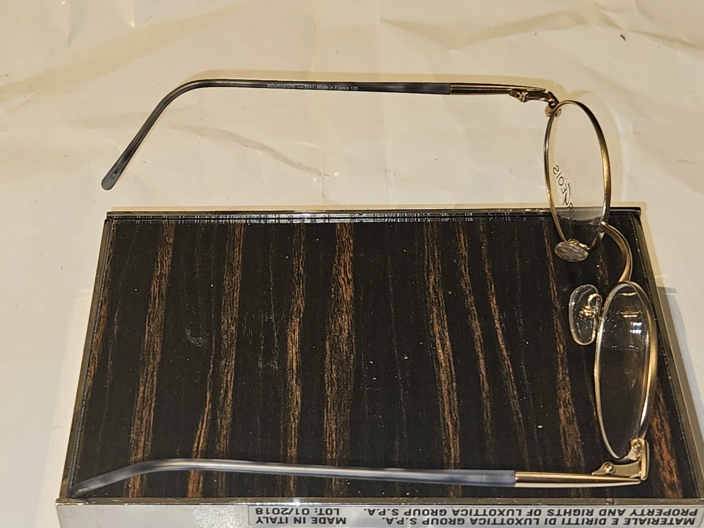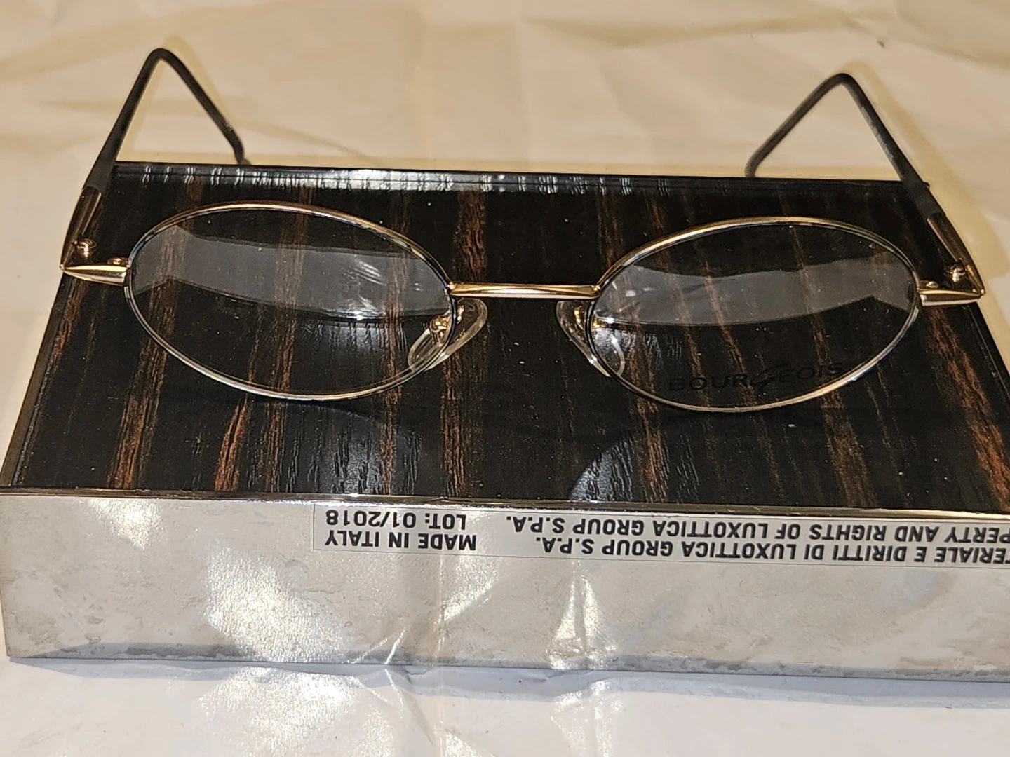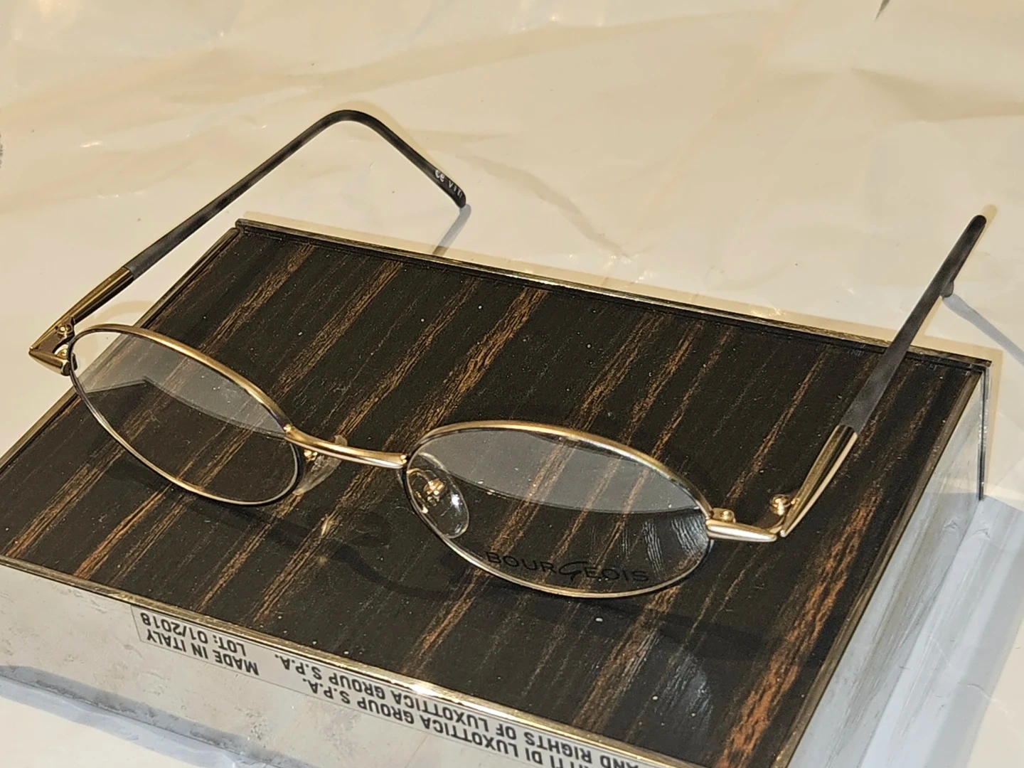 These are Bourjois eyeglasses with gold-toned metal frames and black detailing on the arms. They were made in Italy. They're a classic oval shape, perfect for everyday wear. It's designed to fit any Prescription