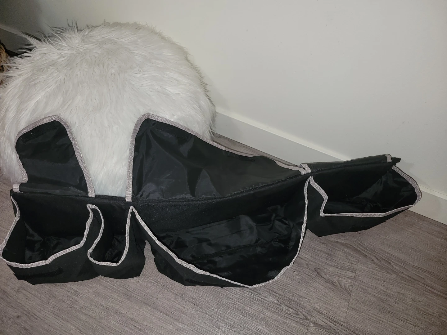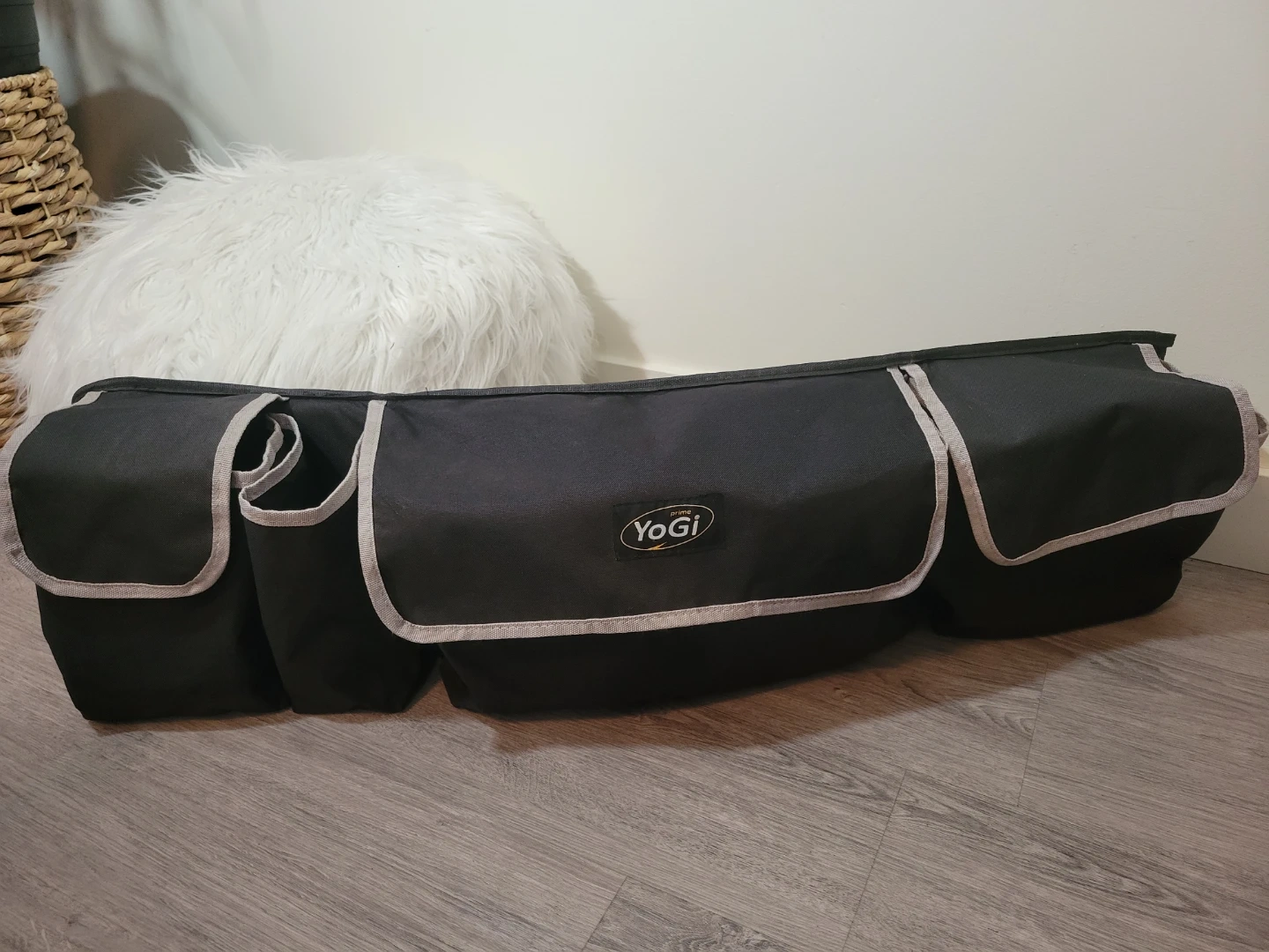 The YoGi Prime hanging car trunk organizer is a foldable, black polyester storage solution designed to maximize vehicle space.