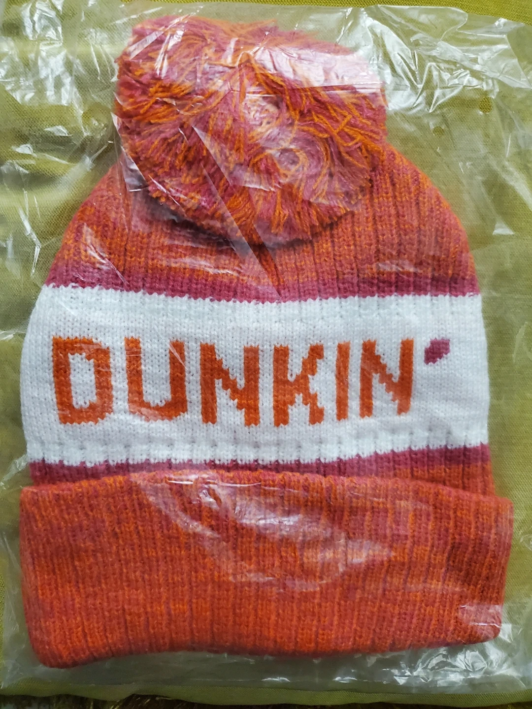 Selling a Dunkin' beanie in orange and white! It's brand new and still in the original packaging. Perfect for Dunkin' lovers or anyone who wants to stay warm in style