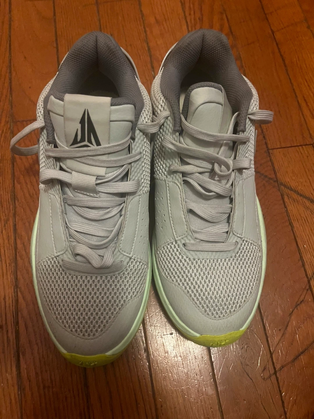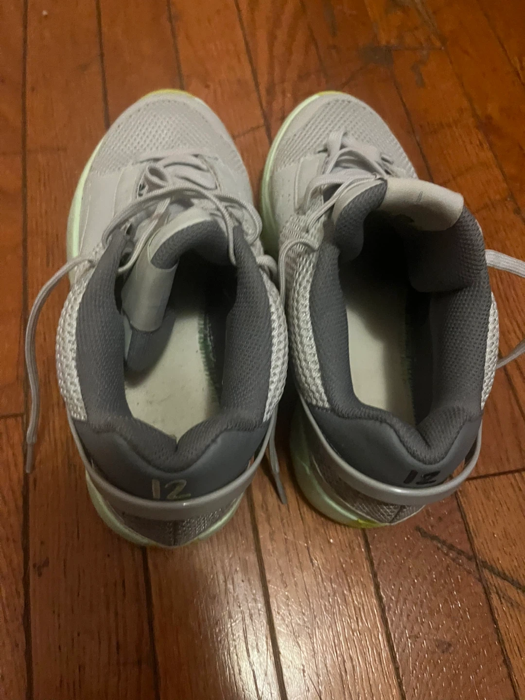 Gray athletic shoes with light green accents. Lace-up closure. Size 8