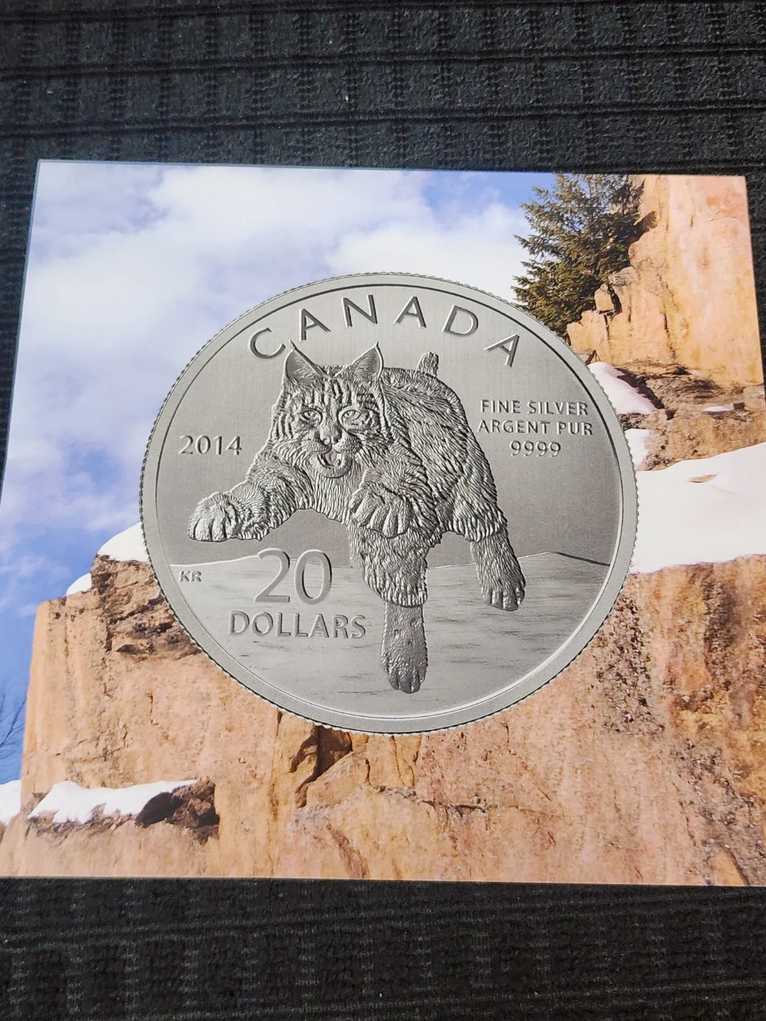 Selling a 2014 Canadian $20 fine silver coin featuring a bobcat. The coin is made of fine silver (99.99% pure) and weighs 7.96 grams. It has a face value of 20 dollars and was designed by artists Leo Rouss (reverse) and Susanna Blunt (obverse). Comes with a certificate of authenticity.