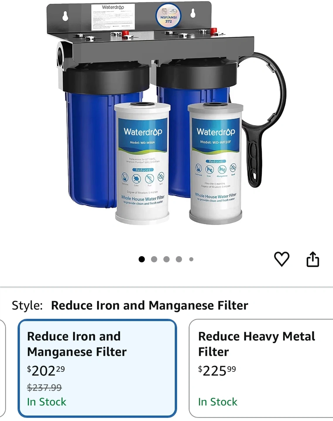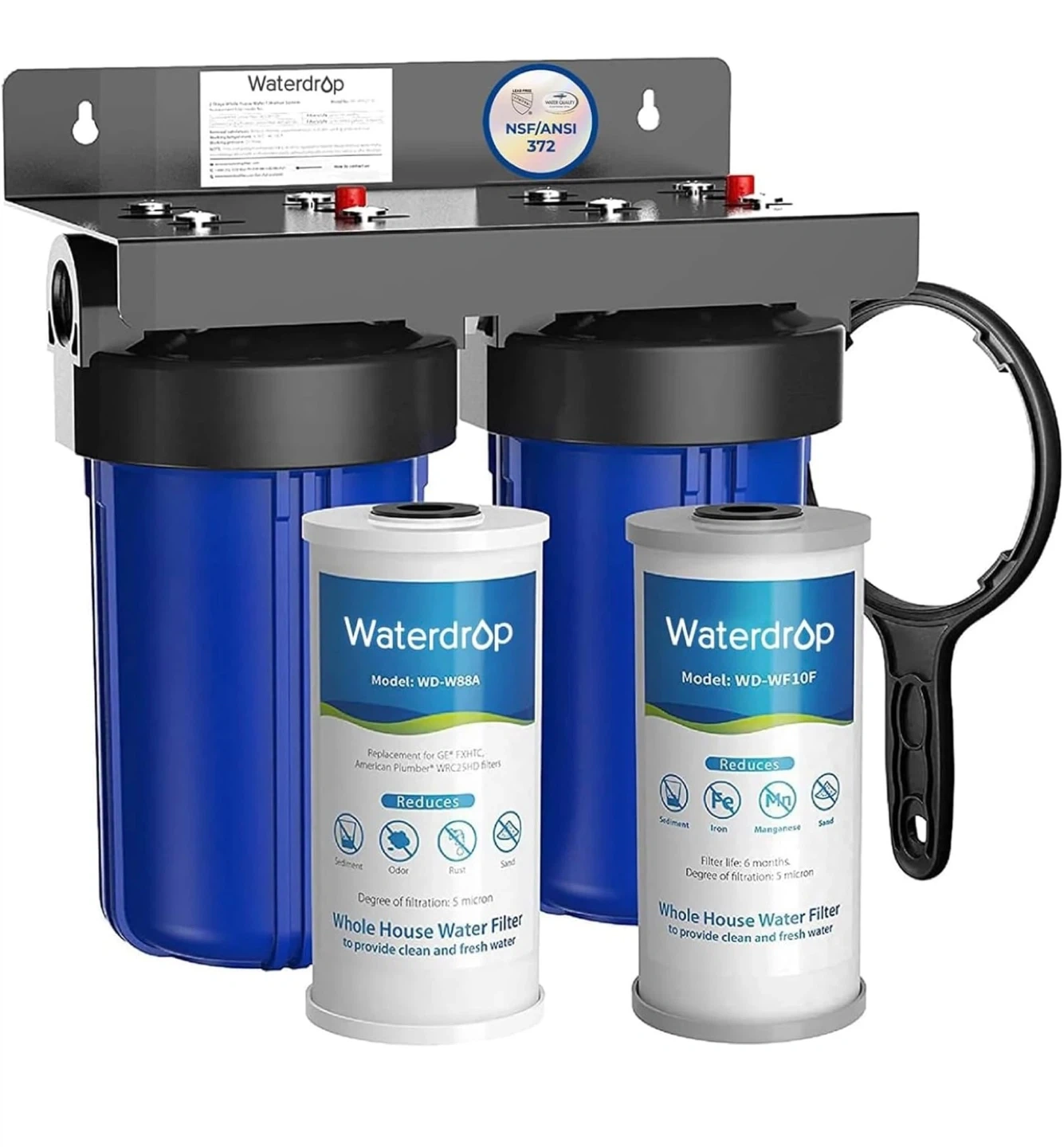 F this Waterdrop WD-WF10F whole house water filter reduces iron and manganese. It provides filtration for up to 6 months and has a degree of filtration of 5 microns. It's designed to provide clean and fresh water. This filter is useful for resolving yellow well water and reducing iron taste.
