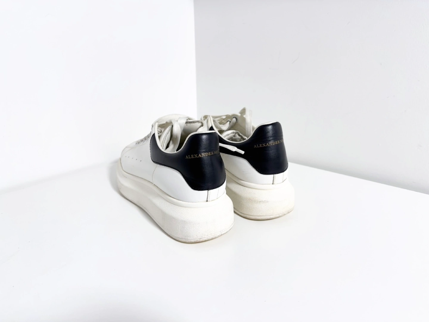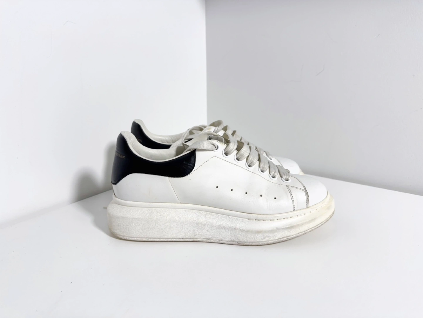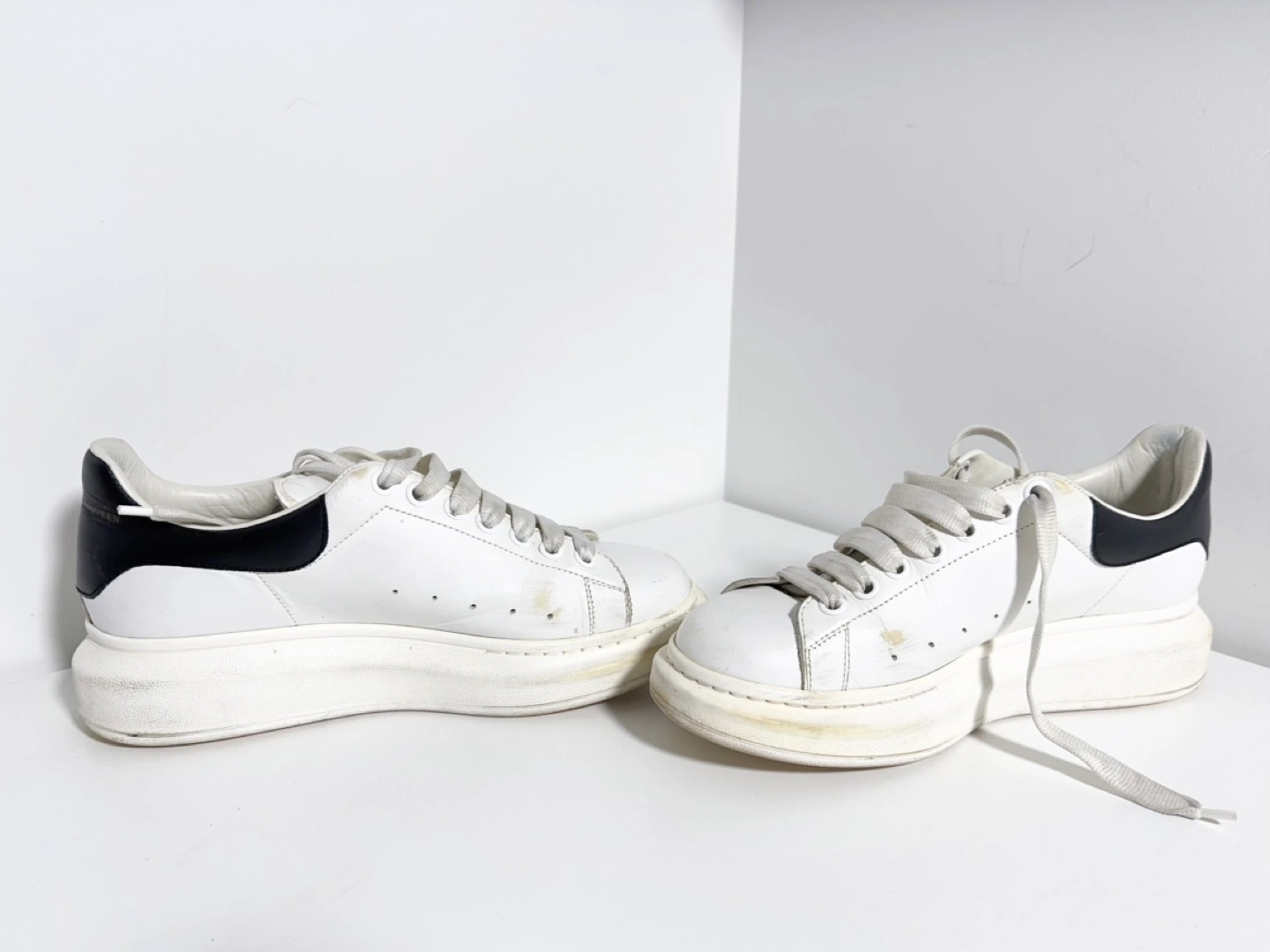 Alexander McQueen hite leather sneakers with black accents. Thick platform sole. Lace-up closure. Pre-owned, some wear.