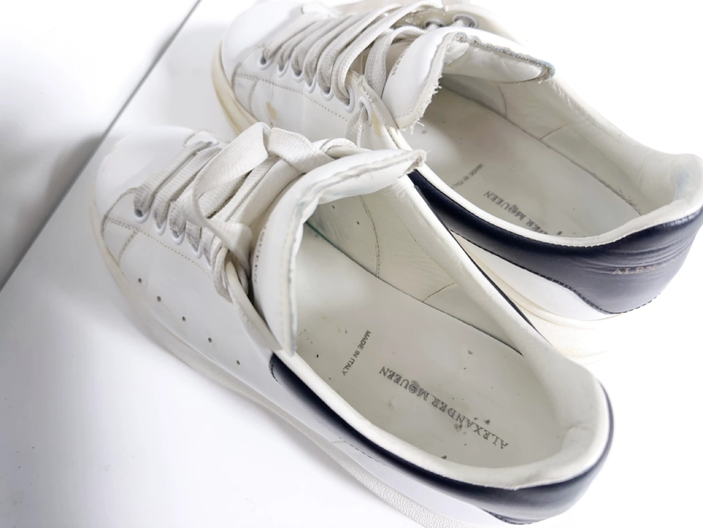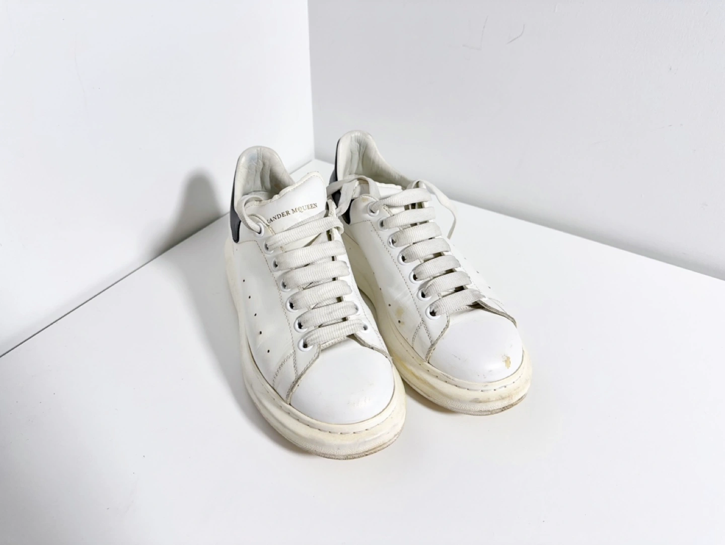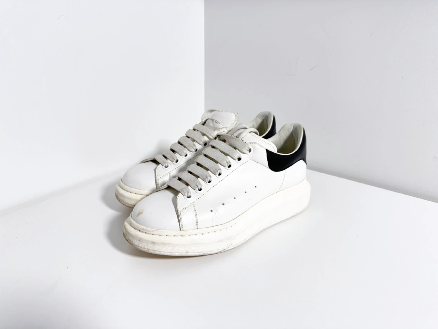 Alexander McQueen hite leather sneakers with black accents. Thick platform sole. Lace-up closure. Pre-owned, some wear.