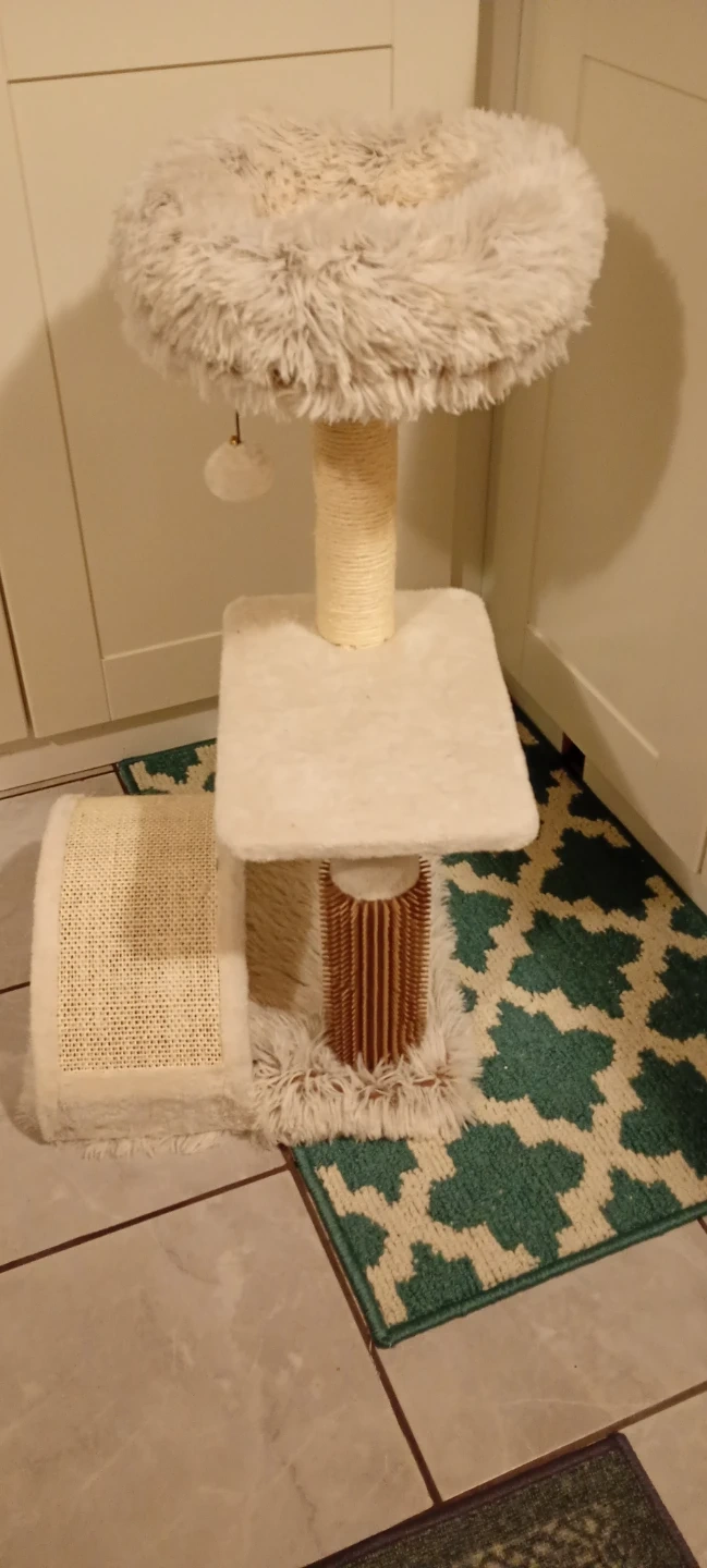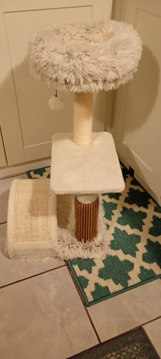 This cat tree condo offers multiple levels for your feline friend to play and rest. It features a plush top perch, a scratching post wrapped in sisal rope, and a lower platform. The soft, fuzzy material provides comfort for your cat. It's a great addition to any home with cats!