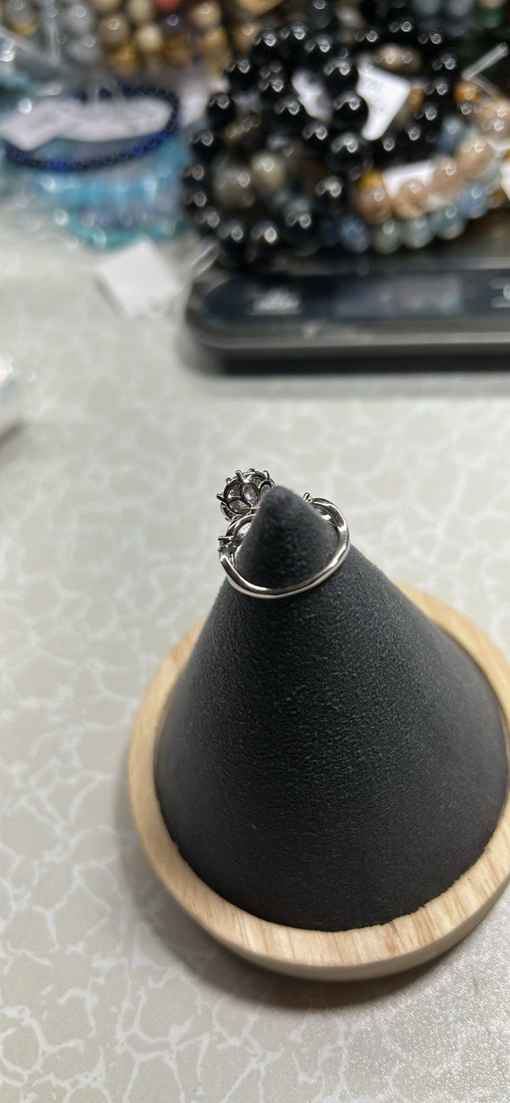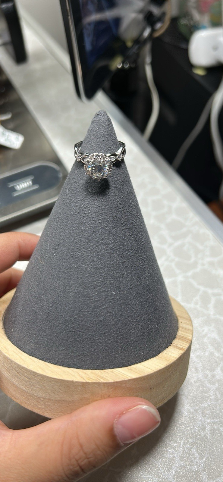 New with packaging. White gold, diamond engagement ring. Size 5. Halo setting, round diamond, white/colorless stone. Women's ring. Moissanite S925