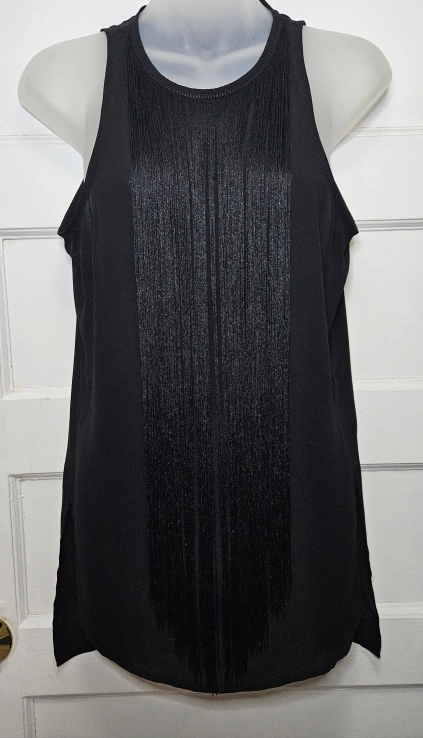 đź’›Express Tunic tank with long black fringe, side slits and is slightly sheer, but the fringe covers quite a bit. There is an invisible zipper in the back.