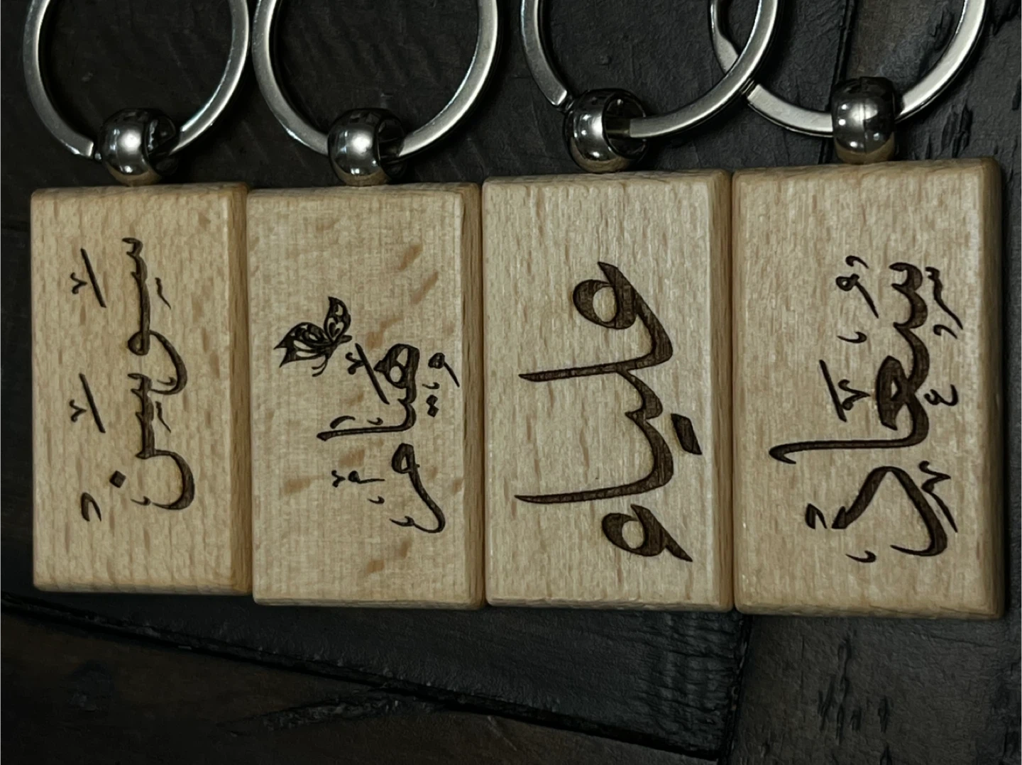 Selling custom engraved wooden keychains. These are perfect for personalizing your keys or as a thoughtful gift. Each keychain is unique with its own engraved design or name. They are made of wood.