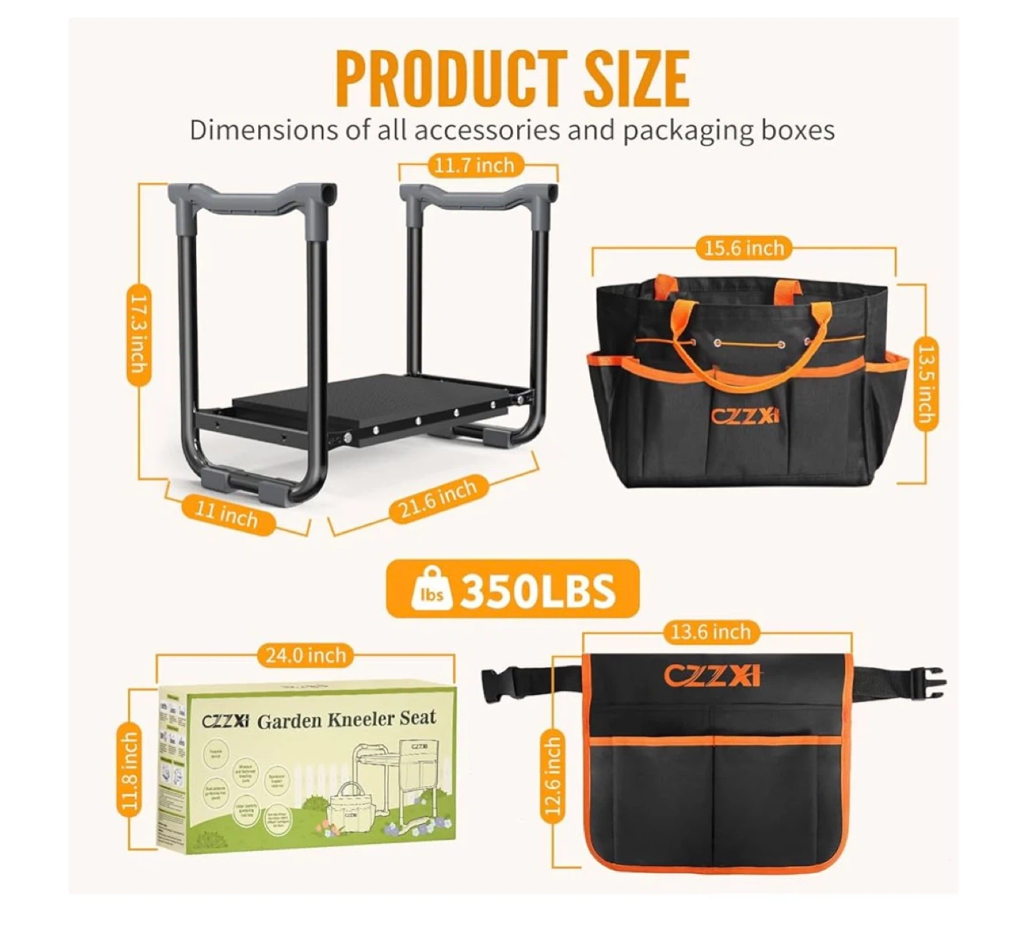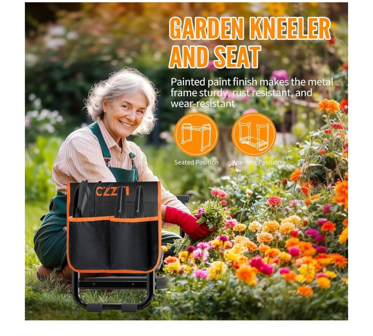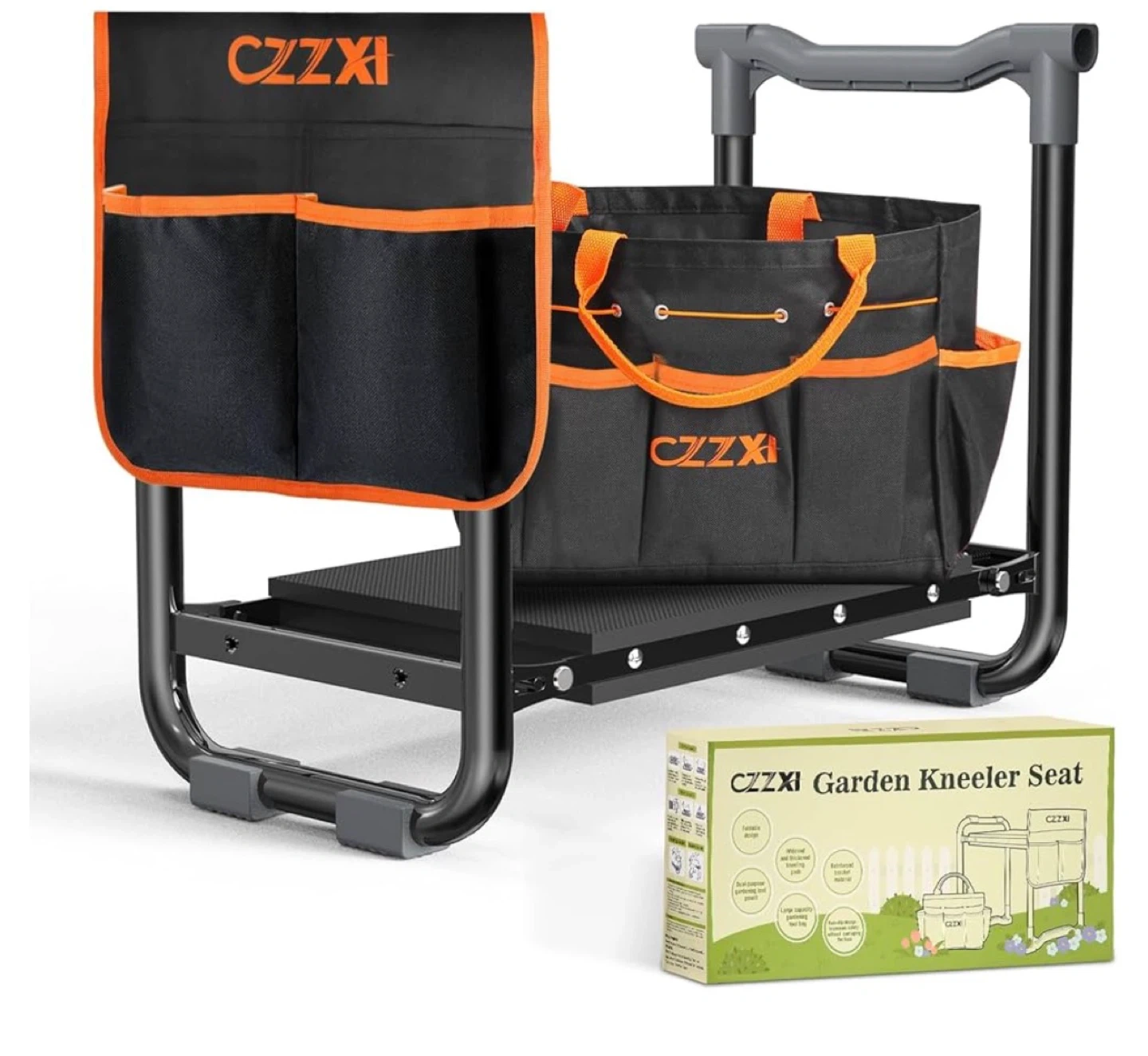 This CZZXI garden kneeler seat is designed for comfort while gardening. It has a sturdy metal frame with a painted finish, making it rust-resistant and wear-resistant. It supports up to 350 lbs and comes with a detachable tool bag and an adjustable tool pouch. This is useful for anyone working in the garden for extended periods.