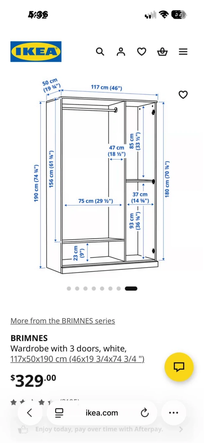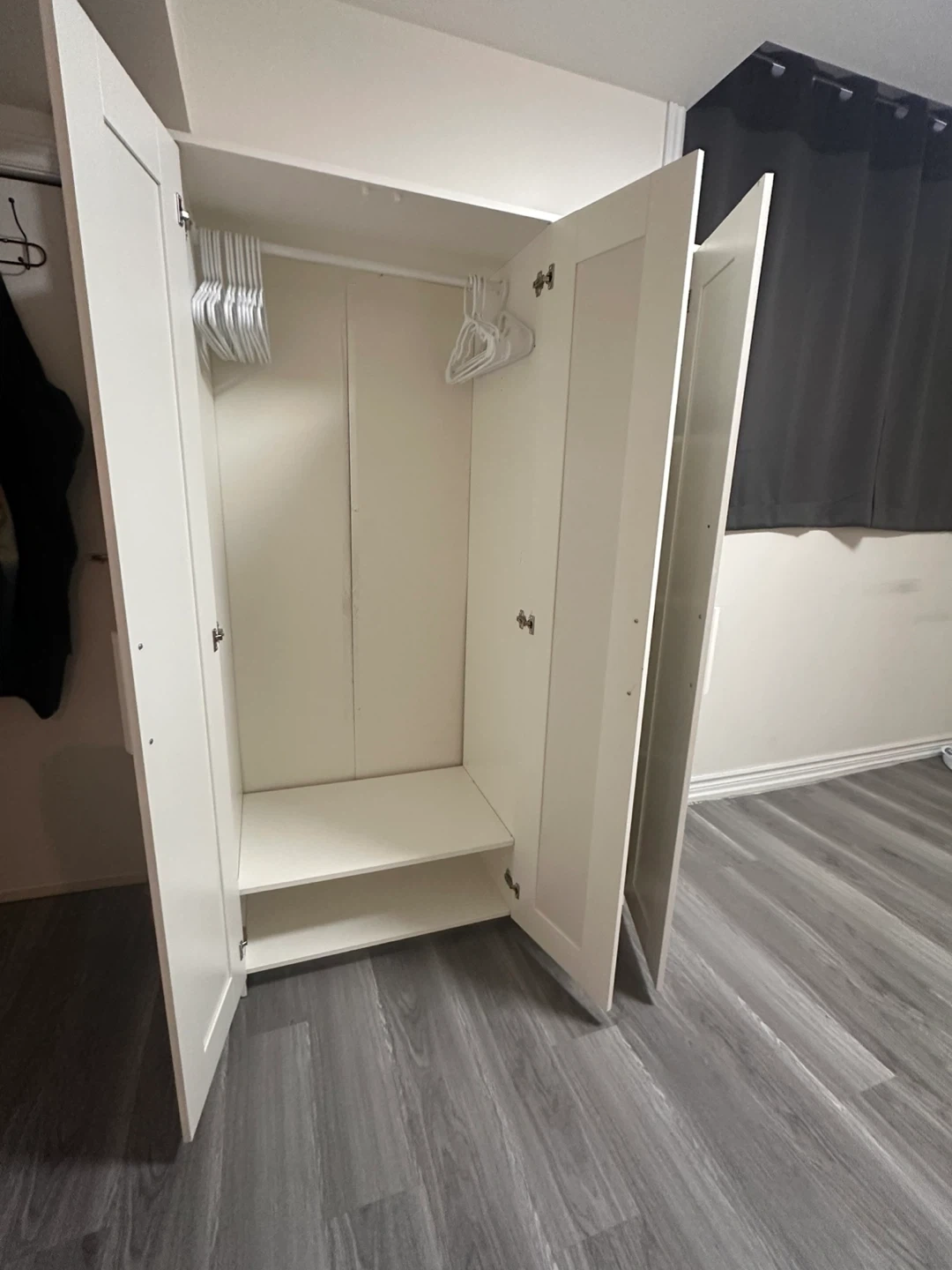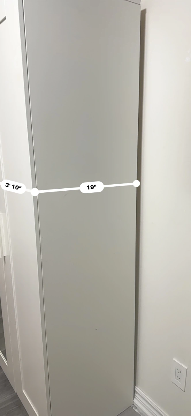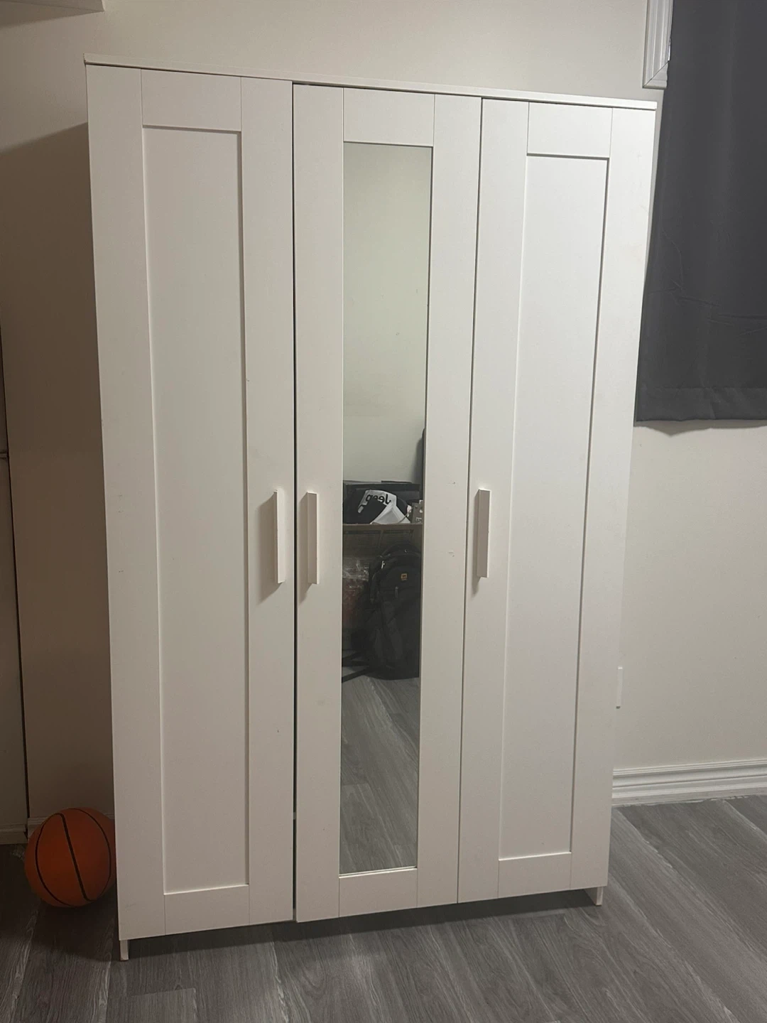This spacious white wardrobe features three doors, with two of them containing mirrors. It measures 3' 10" wide and stands 6' 1" tall, offering ample hanging and shelf space for your clothing and accessories. It's a practical storage solution for any bedroom!
