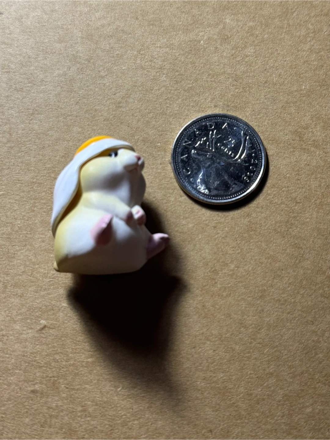 This is a cute hamster figurine wearing a fried egg as a hat. It's a small decorative piece. The figurine is approximately the size of a Canadian quarter.