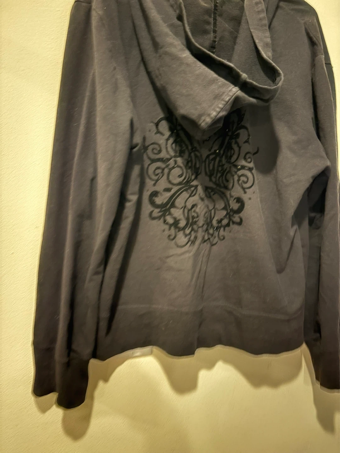 This black zip-up hoodie features a classic design with two front pockets and a full zip closure. It's made for comfort and casual wear. Great for layering on cooler days!
