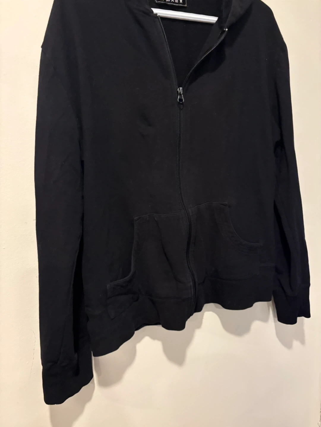 This black zip-up hoodie features a classic design with two front pockets and a full zip closure. It's made for comfort and casual wear. Great for layering on cooler days!