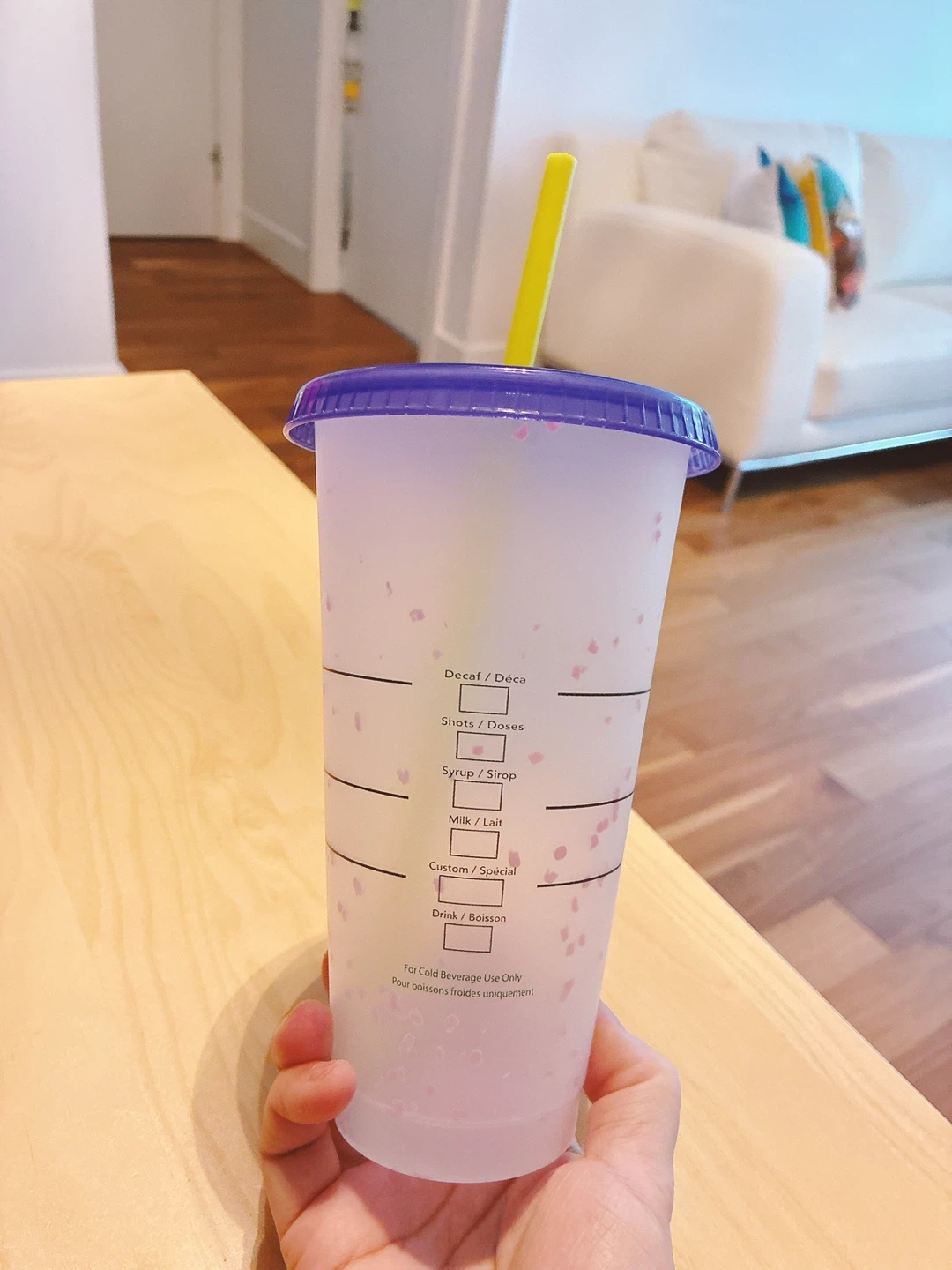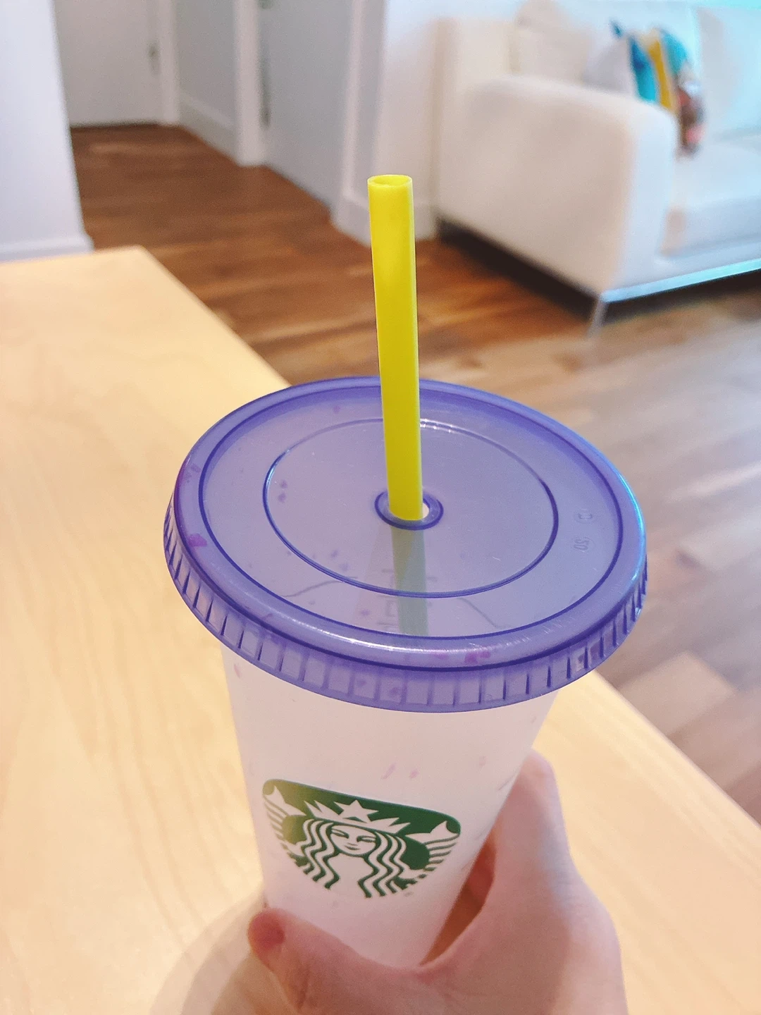 This is a Starbucks Venti cold cup that changes colour. It comes with a reusable purple lid and a yellow straw. Perfect for enjoying your favourite cold beverages on the go!