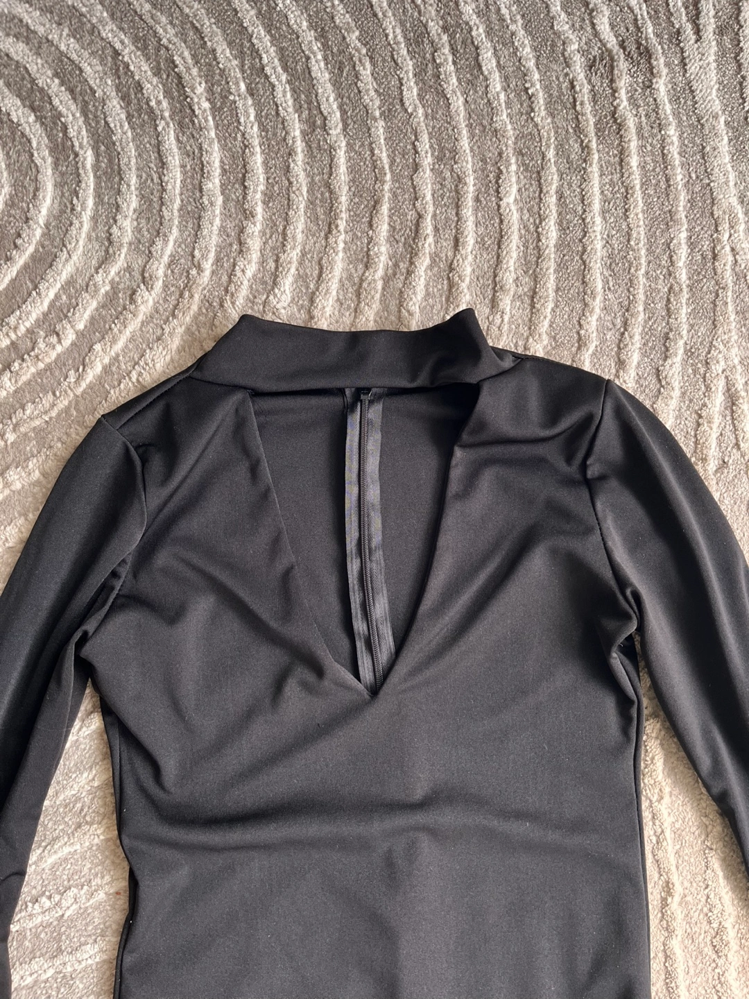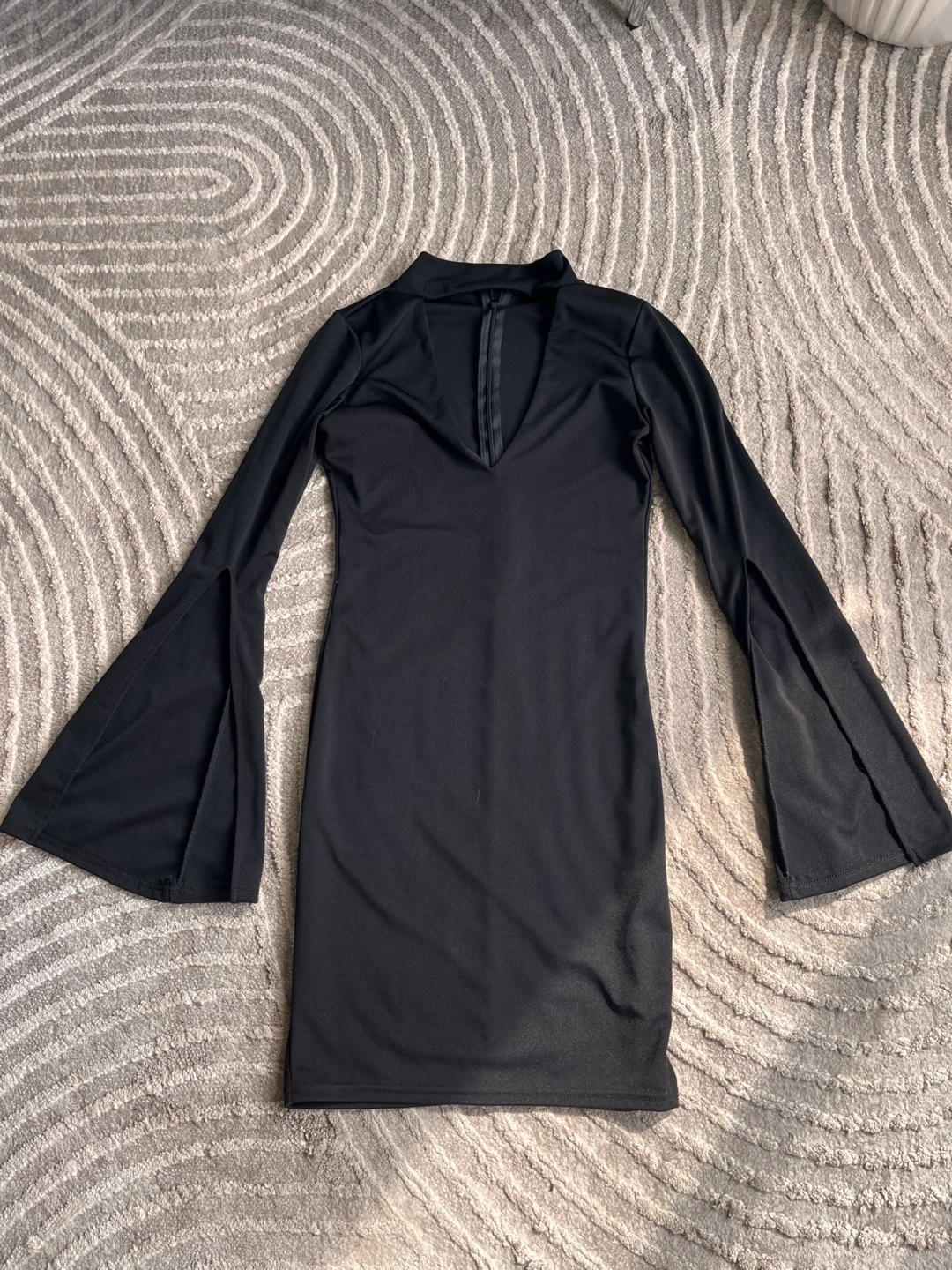 Form-fitting mini dress. Features long bell sleeves and a keyhole neckline. Great for a night out.