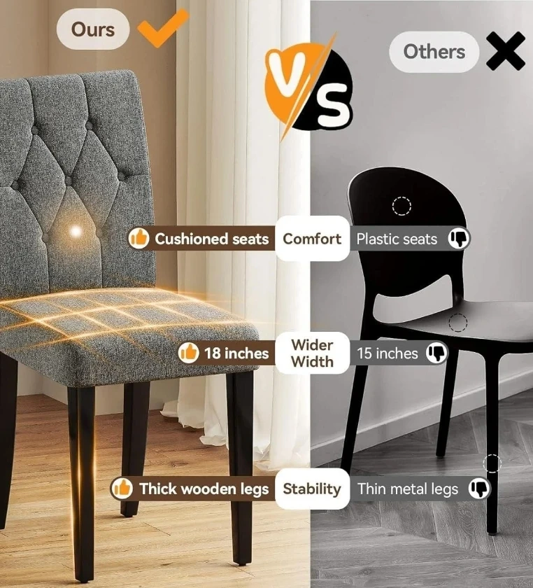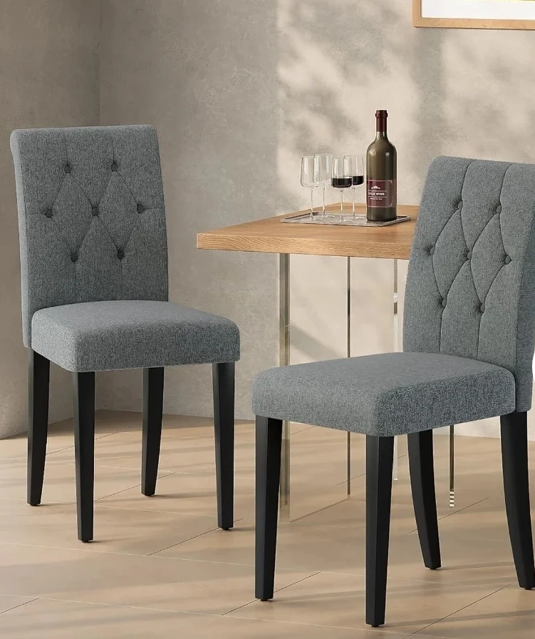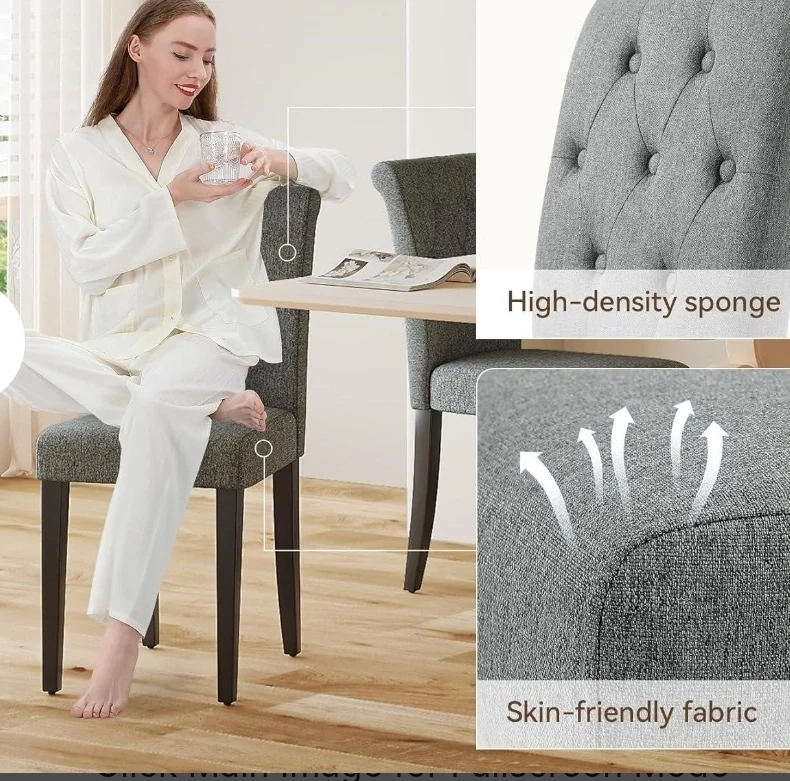 These dining chairs have a tufted back and cushioned seats for comfort. The upholstery is a skin-friendly fabric with high-density sponge. They feature thick wooden legs for stability. Chairs are 18 inches wide. This is 2 set 4 pieces.