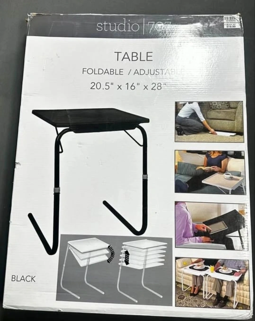 This is a black Studio 707 table that's foldable and adjustable. Dimensions are 20.5" x 16" x 28". It's great for use in various settings like the couch or bed.