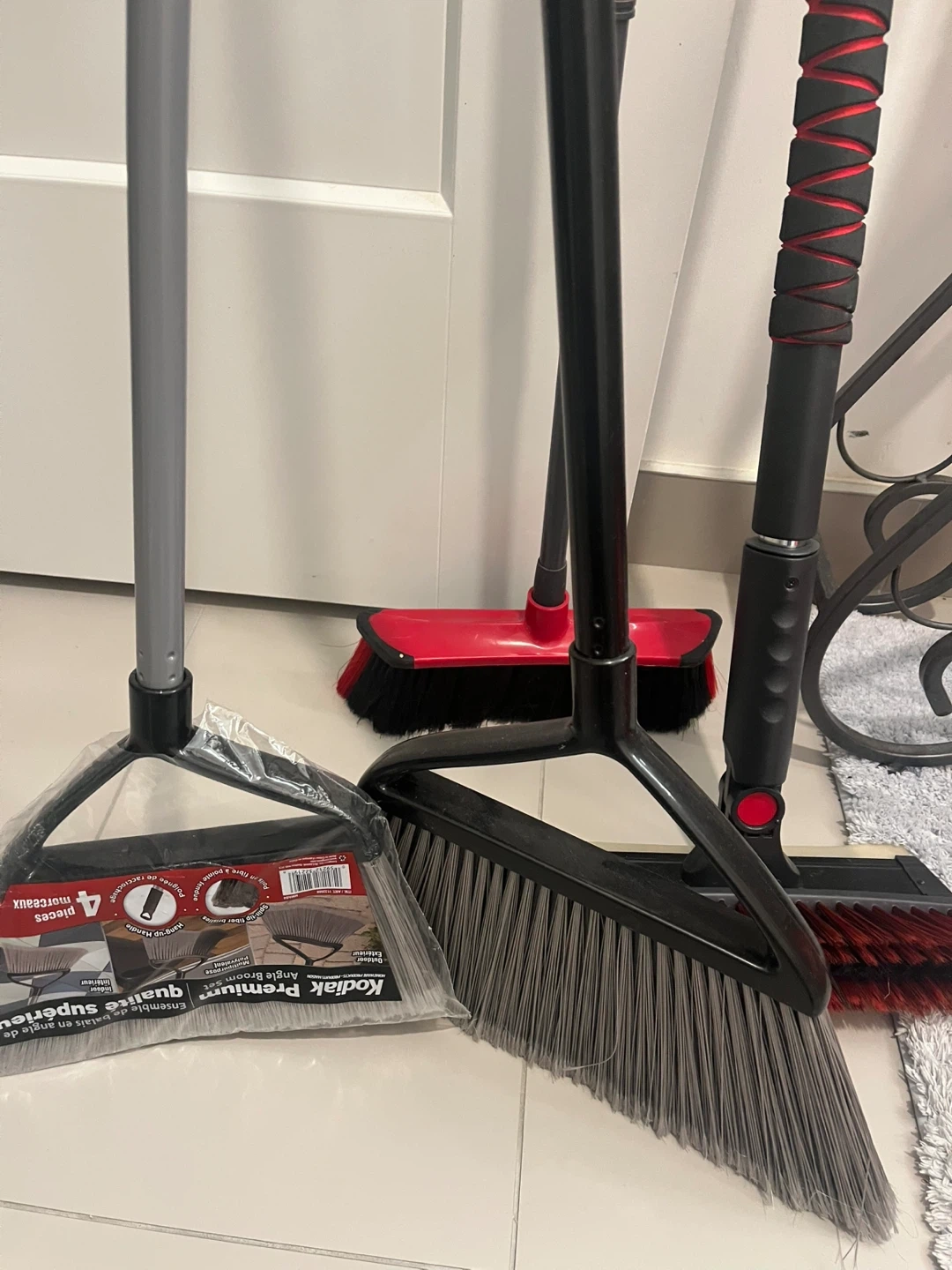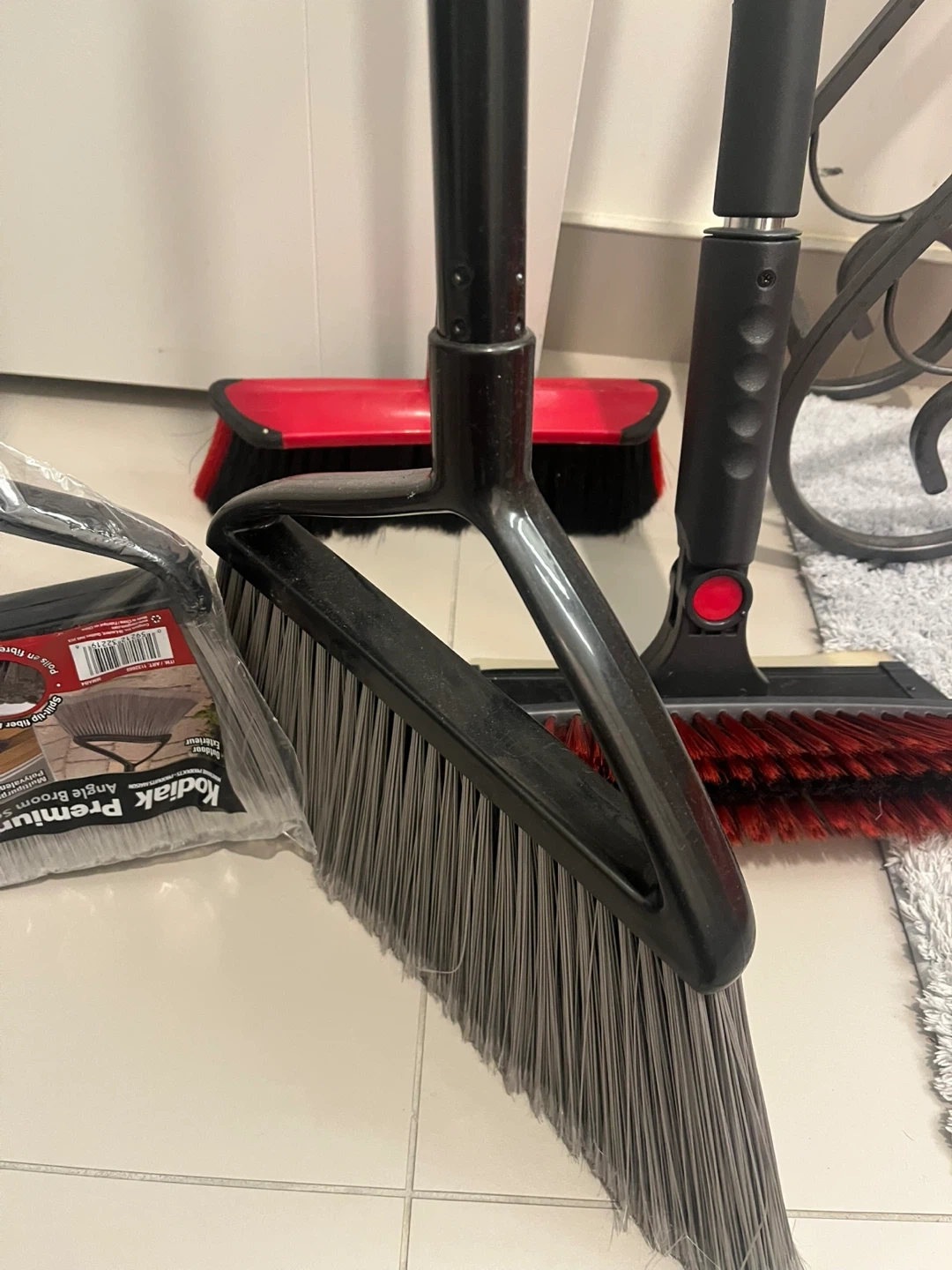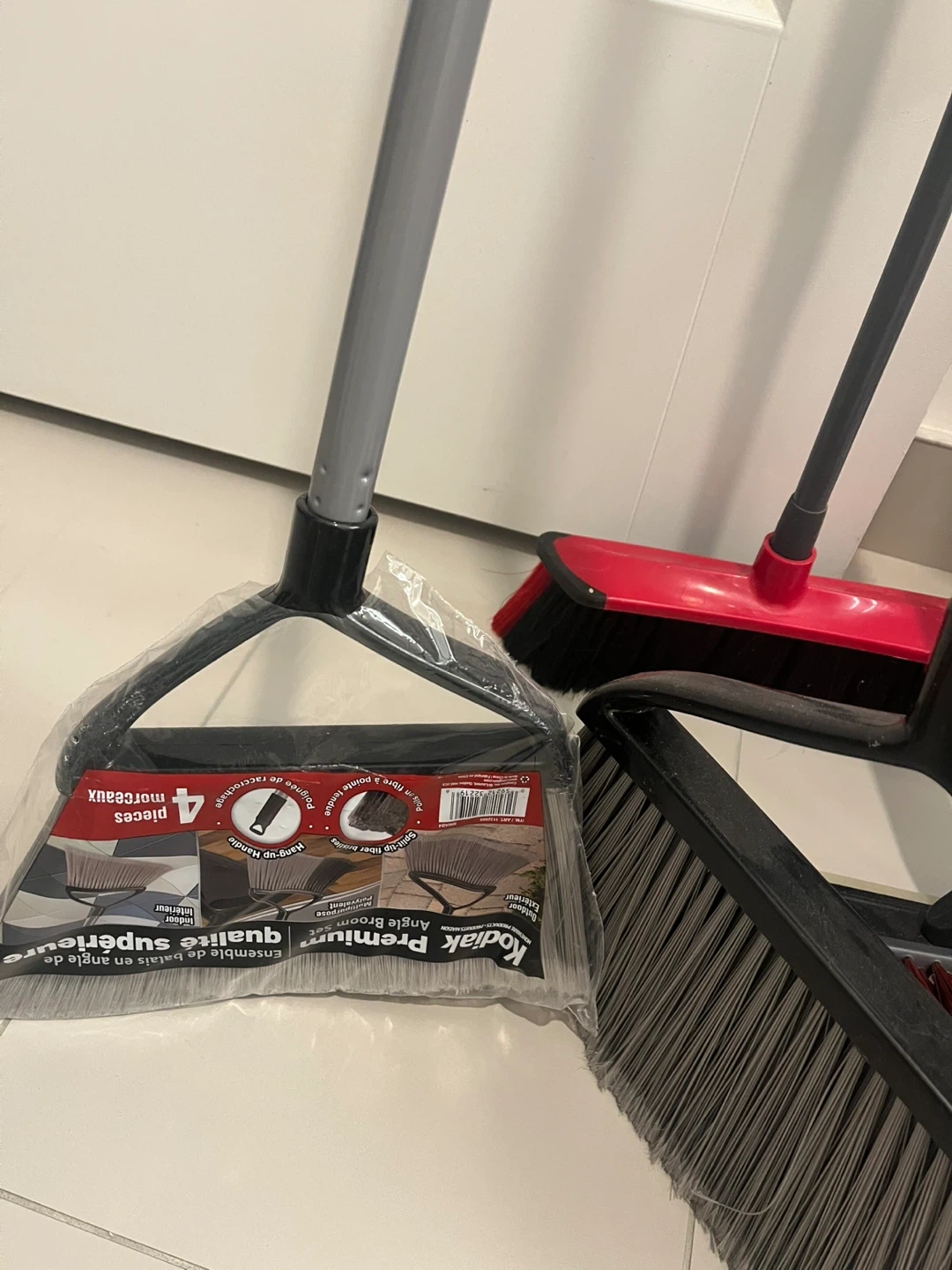 Kodiak Premium 4-piece angle broom and dustpan set. Bristles are grey and handle is silver. Designed for effective sweeping and easy debris collection. This set is great for quick cleanups around the house!